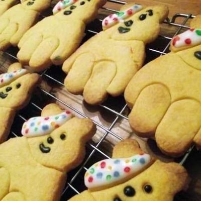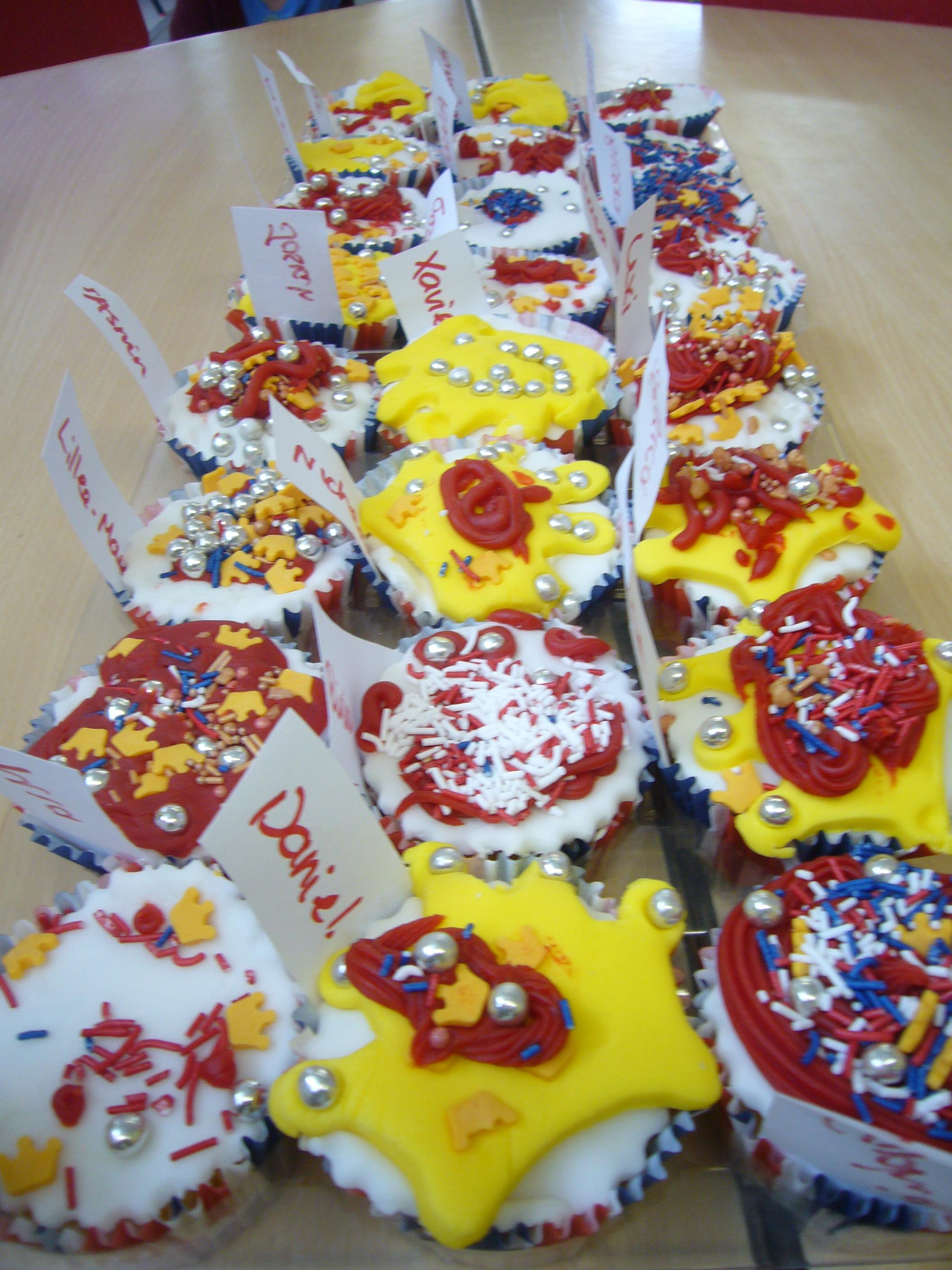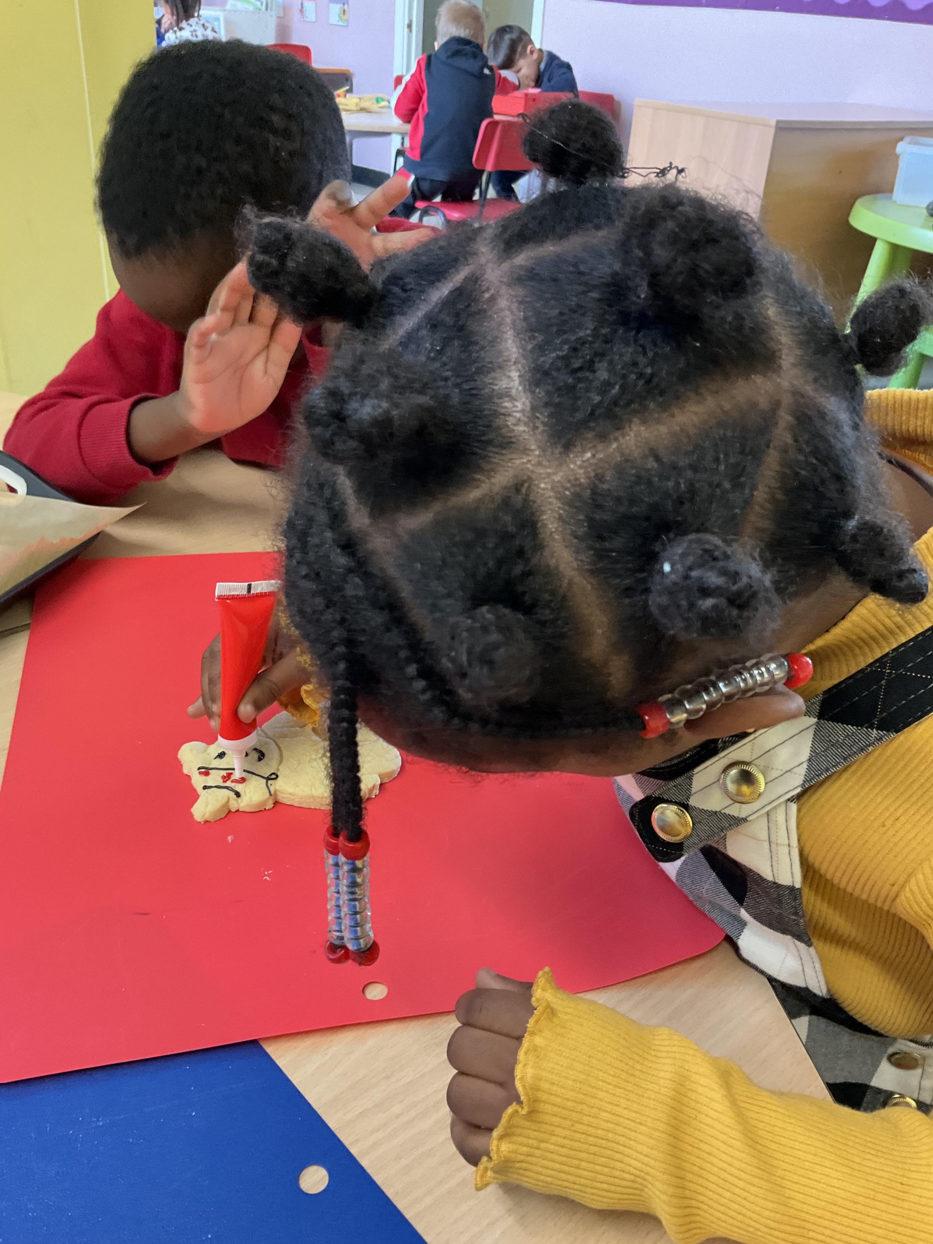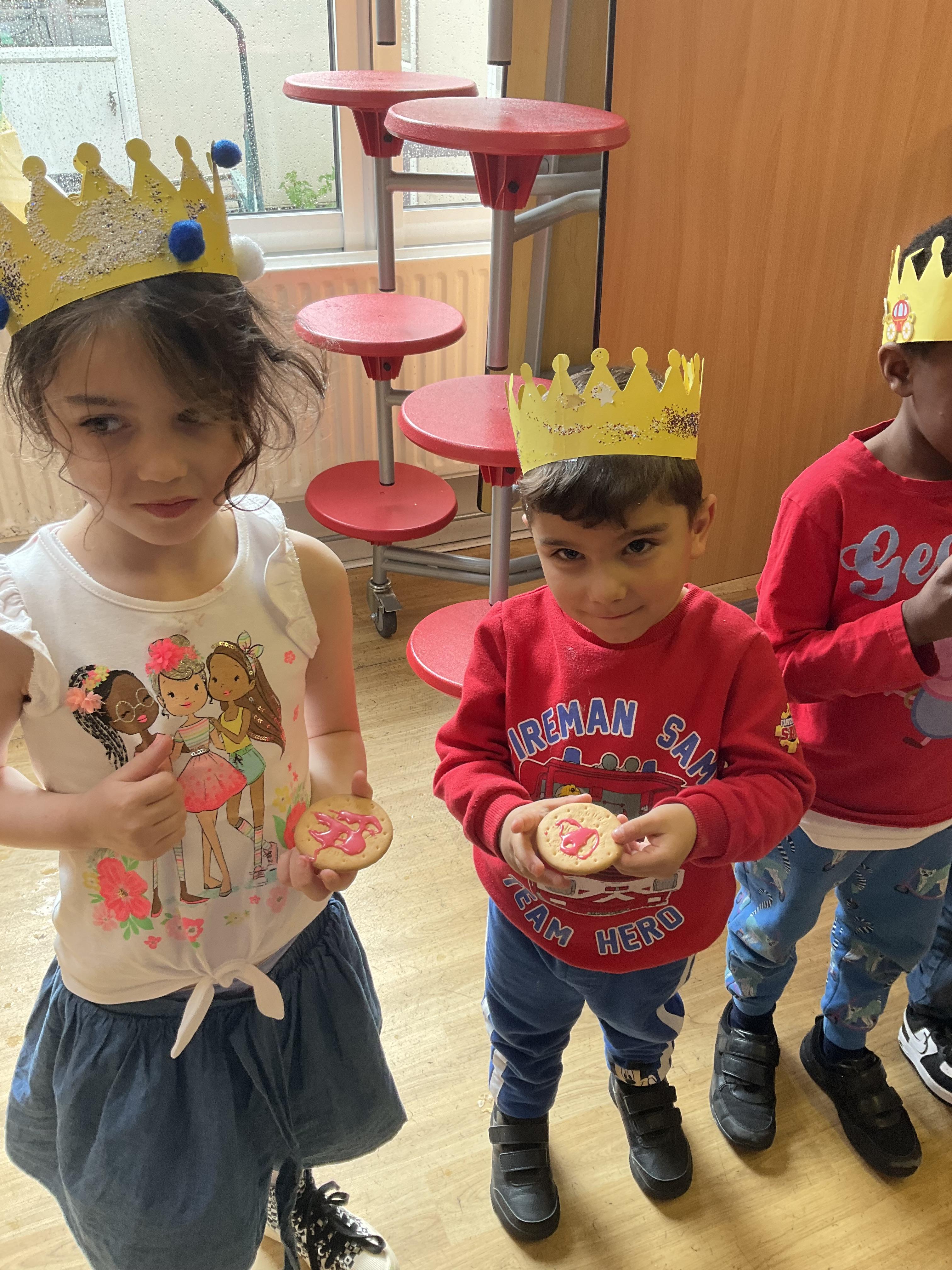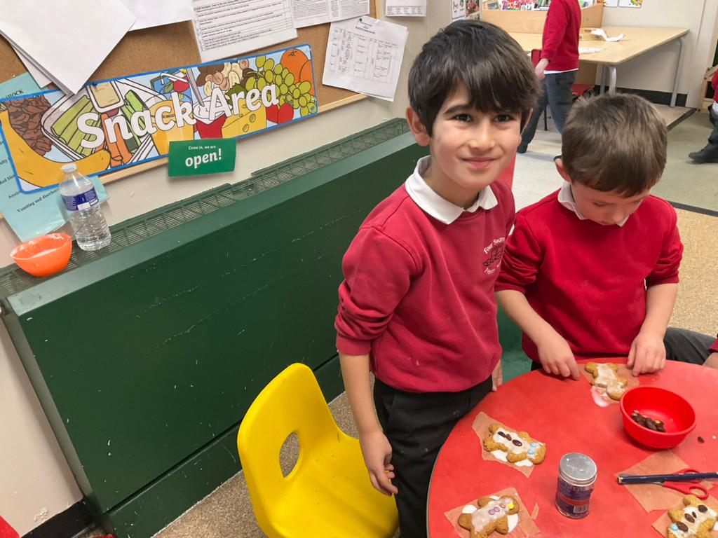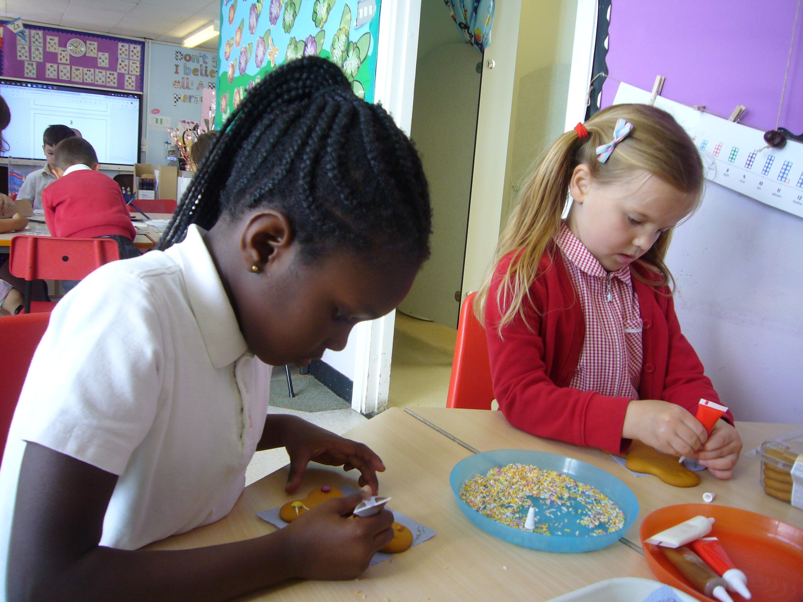 We then decorated the biscuits using icing sugar, resins and chocolate buttons. The children had to count how many eyes and buttons he had.