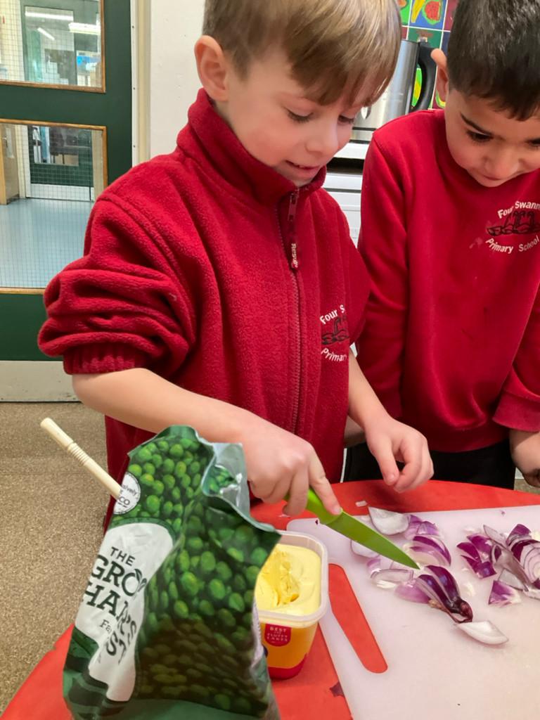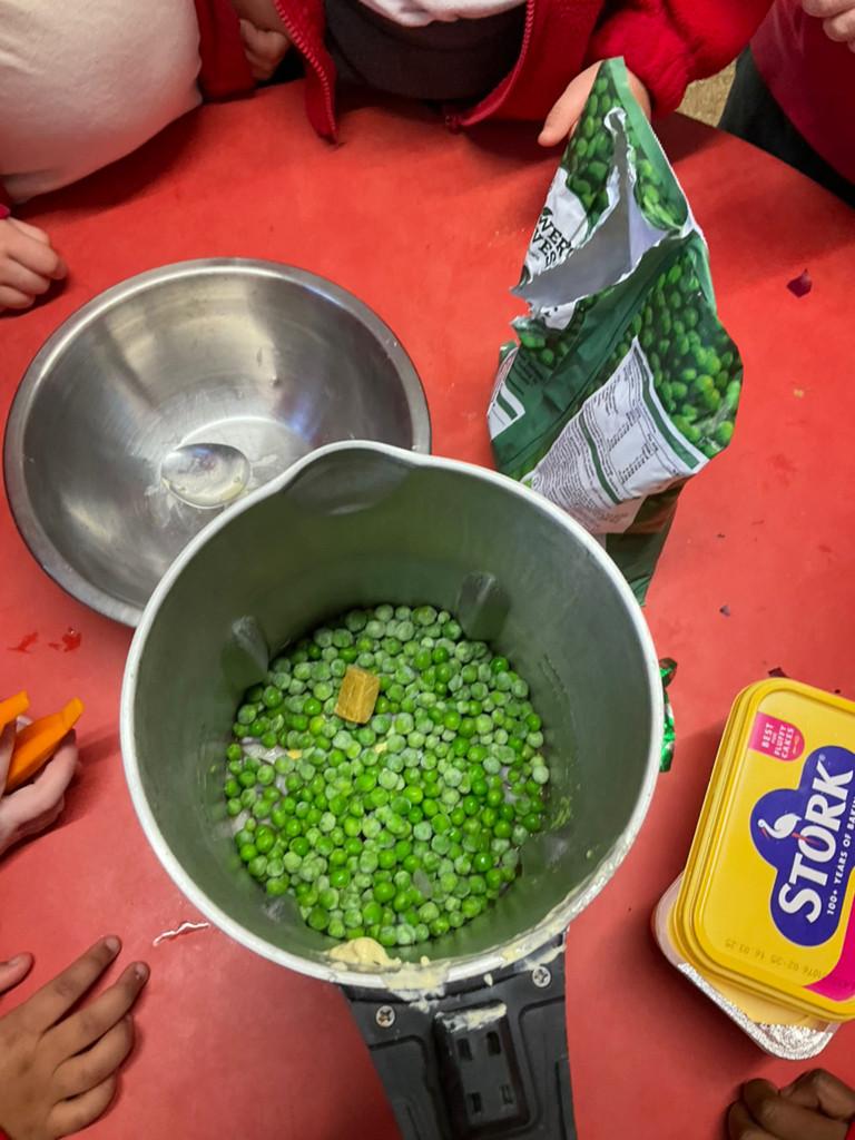 After reading the book, Princess and the pea, the children cooked pea soup. First the children washed their hands and we went through the ingredients. Then we had turns to cut the onions, adding water, adding peas and mixing. Finally, the children tasted the delicious soup that they cooked and some children even asked for a second bowl of soup