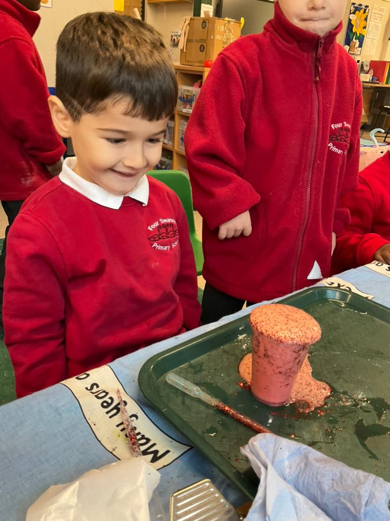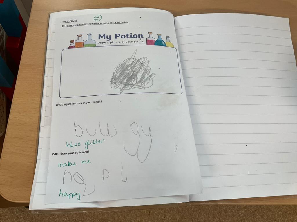After reading the book, Meg’s castle by Helen Nicoll ad Jan Pienkowski, the children made potions using different ingredients. They were amazed by what vinegar can do to sodium bicarbonate and described the reaction as “magical explosion”! They had to think about what to add and what their magic potions could do. We then used our phonetic knowledge to record our work.