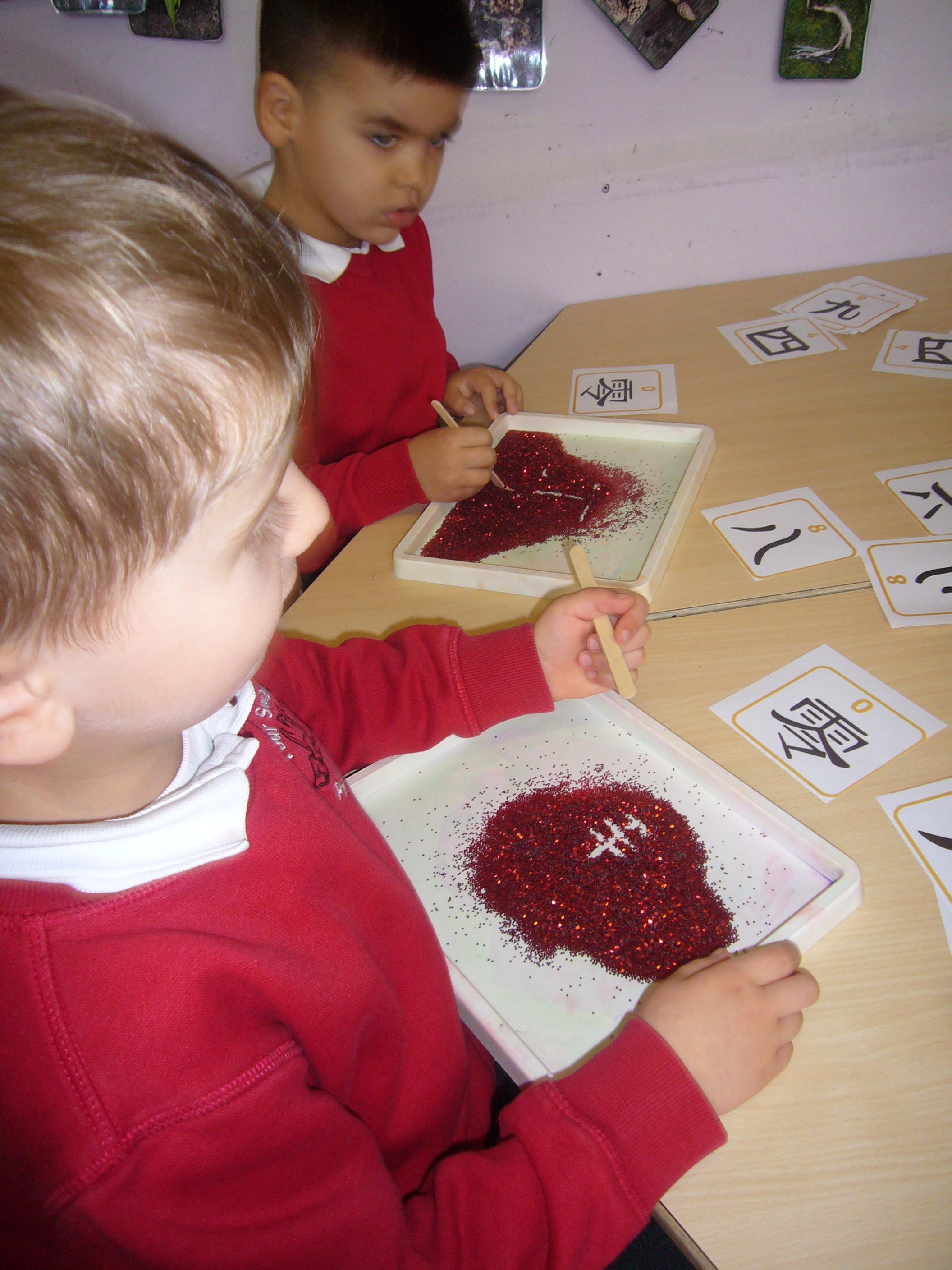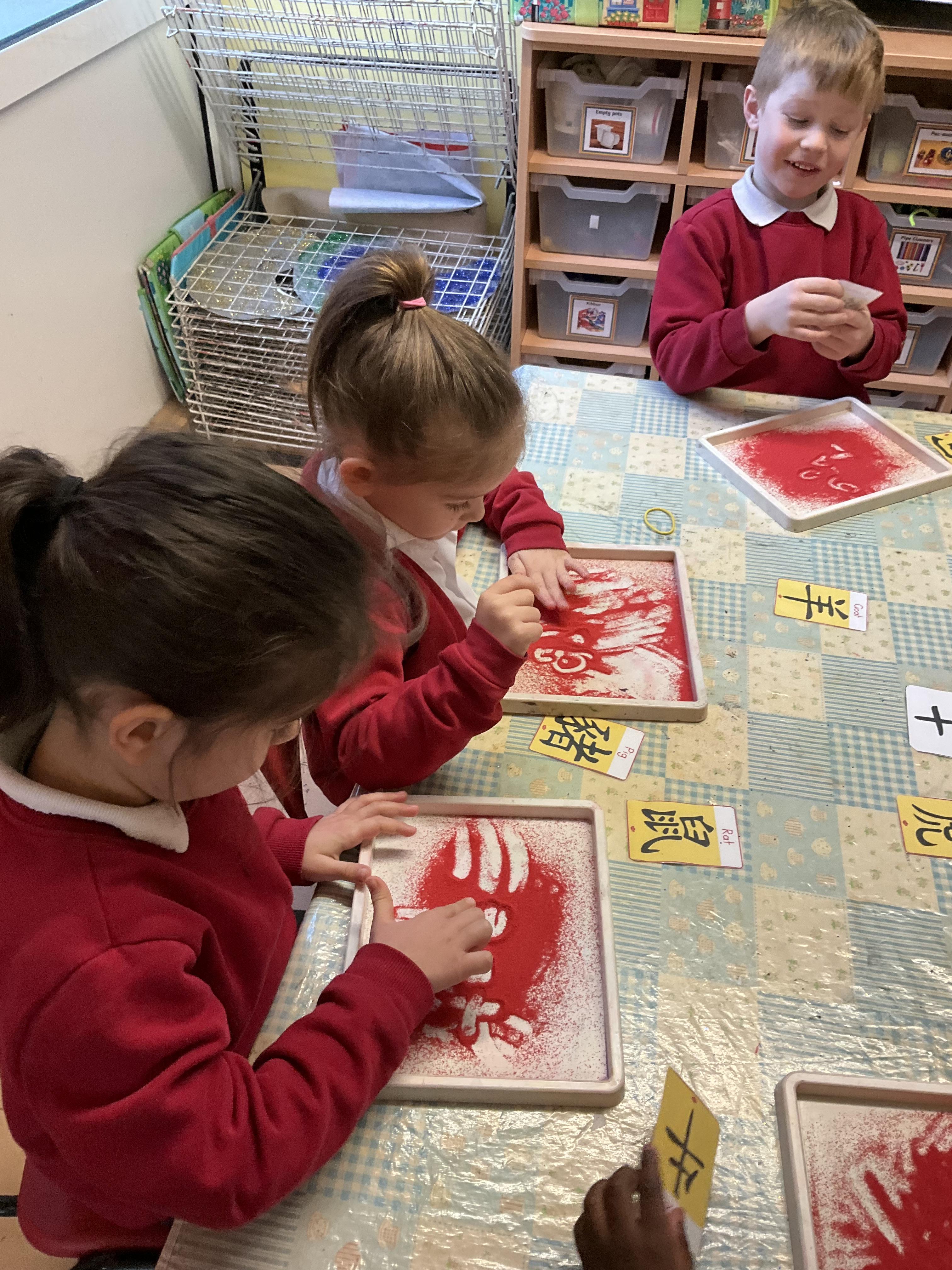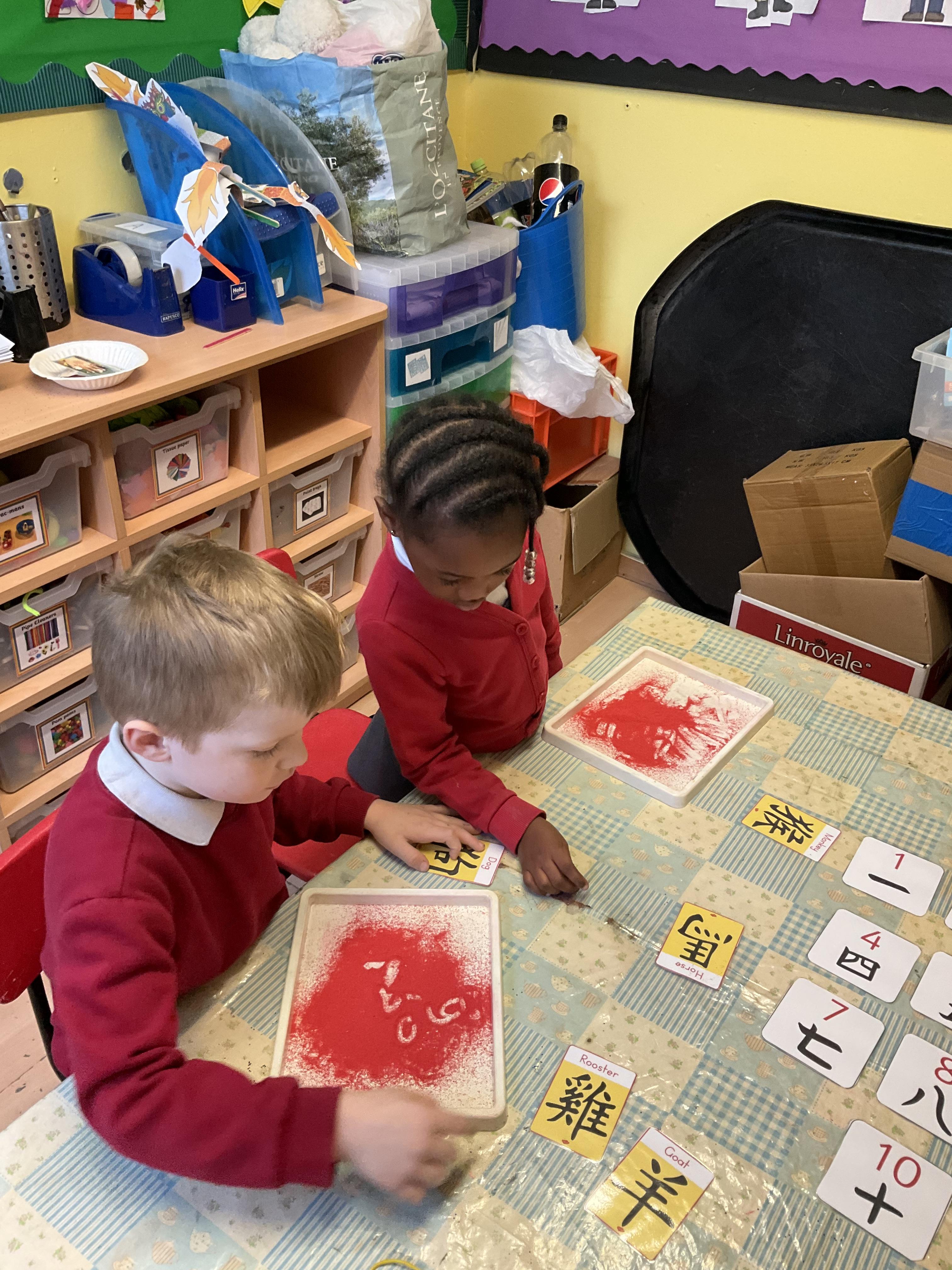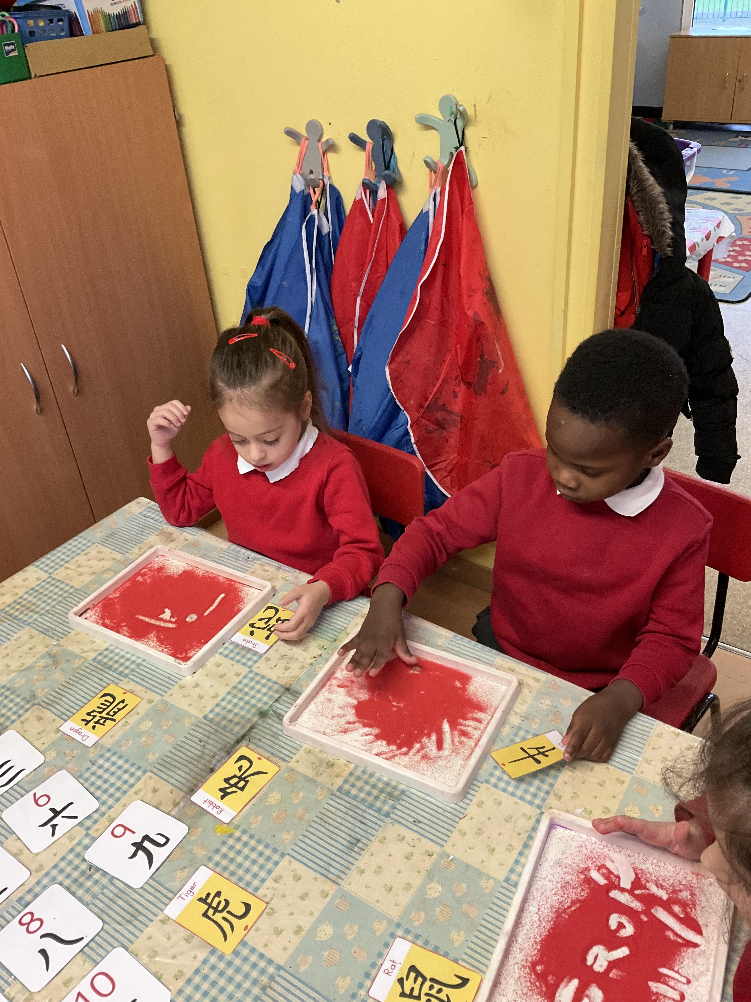 This week the children have been learning about the festival Chinese New Year. They have watched videos to develop their understanding. The children have also listened to the Chinese New Year story and learnt about all the animals in the story. They have also explored writing numbers and animal names in Chinese in coloured sand. The children have also watched the dragon dance and had a go at making their own dragons.