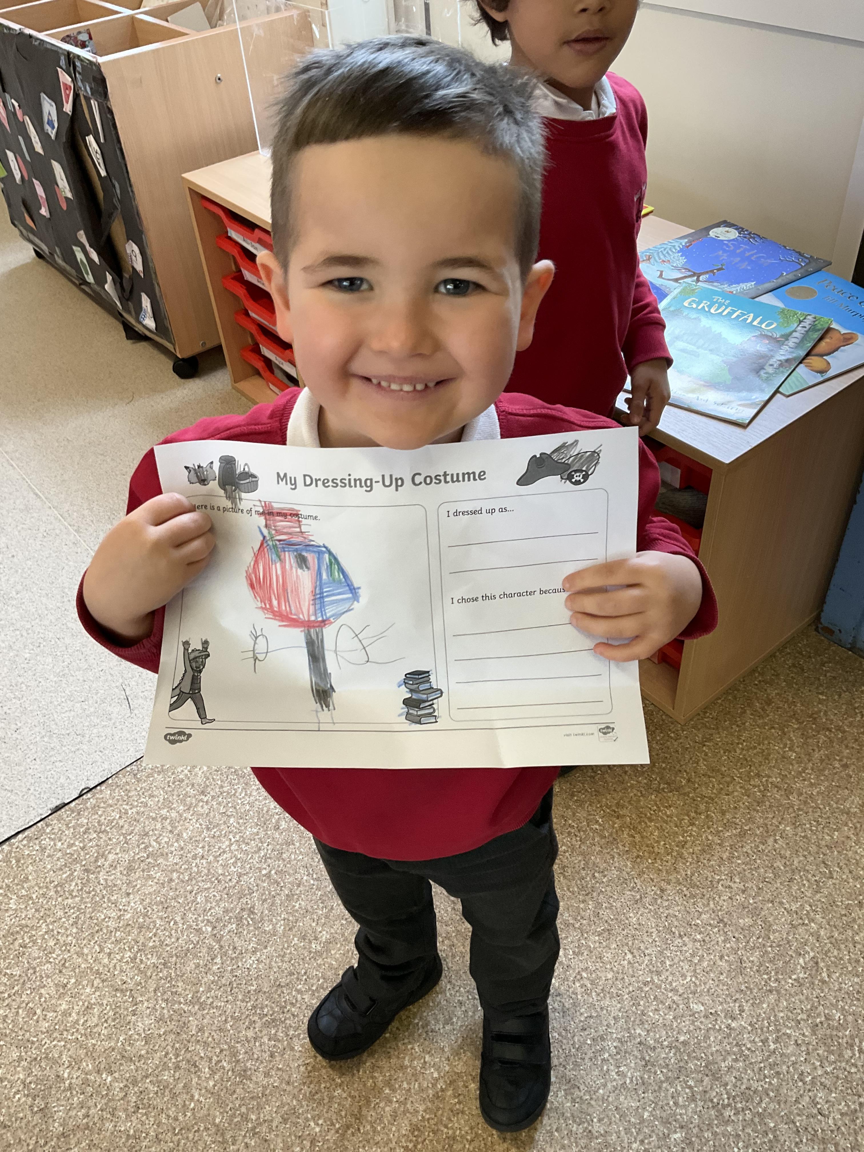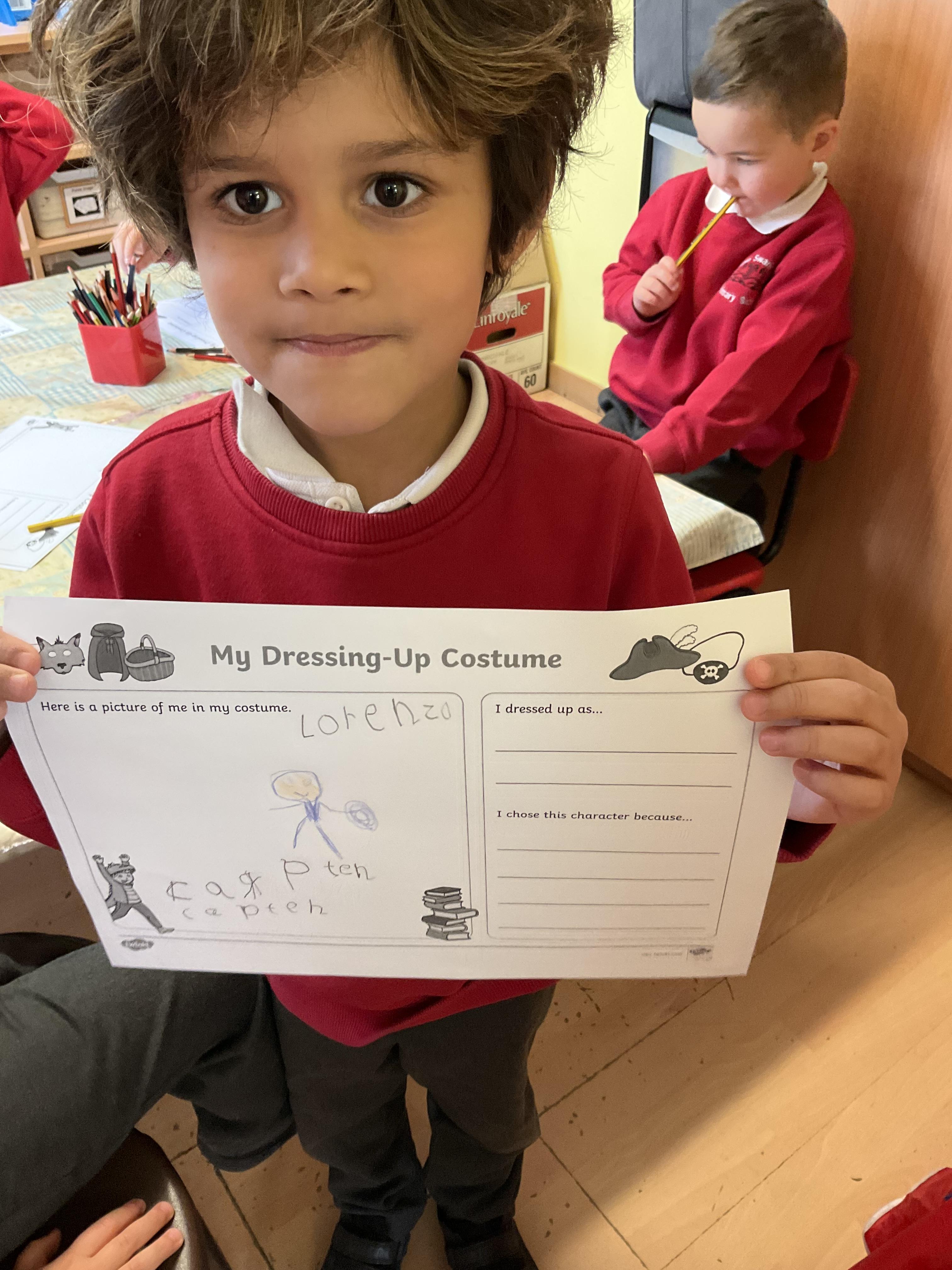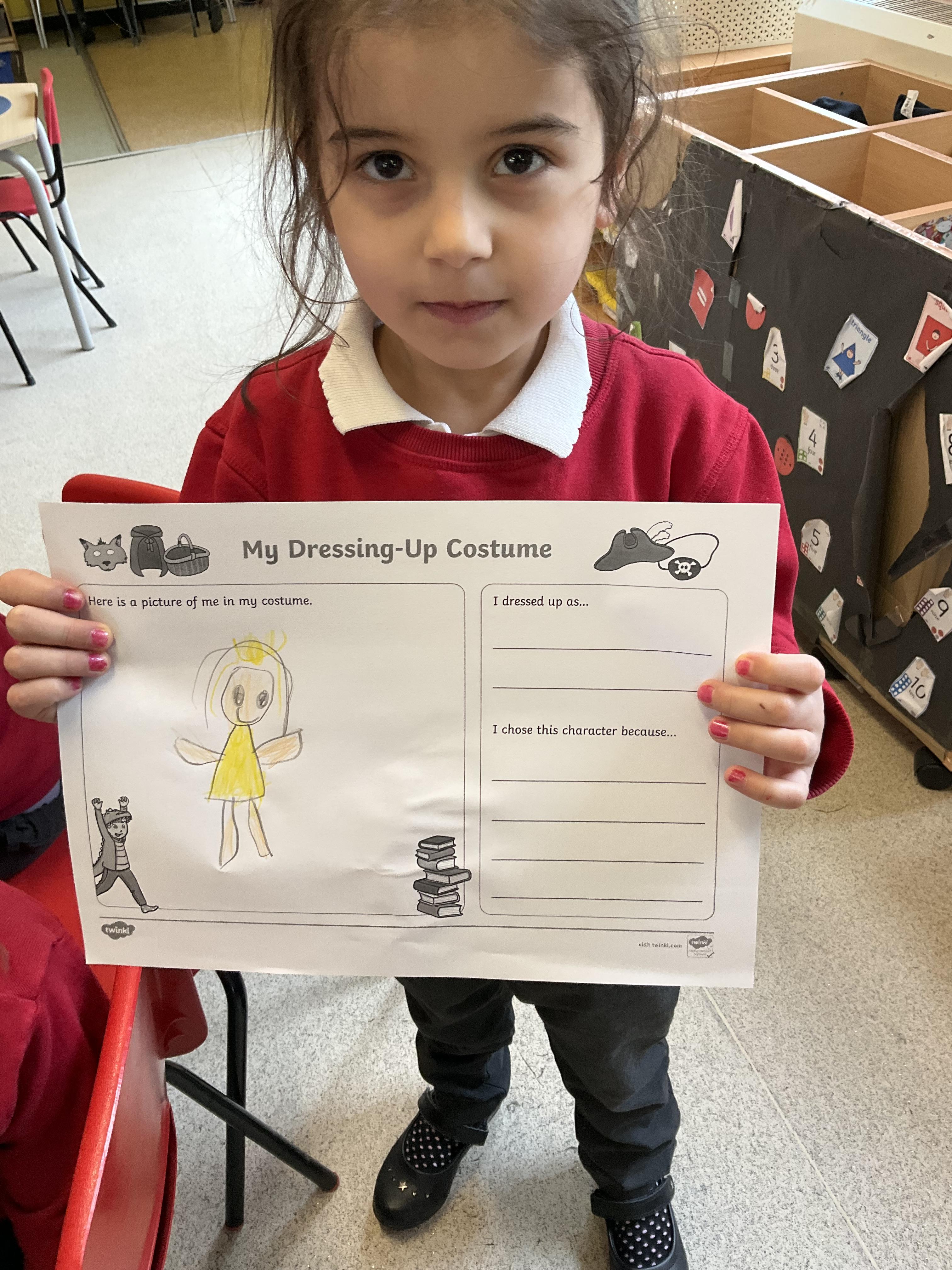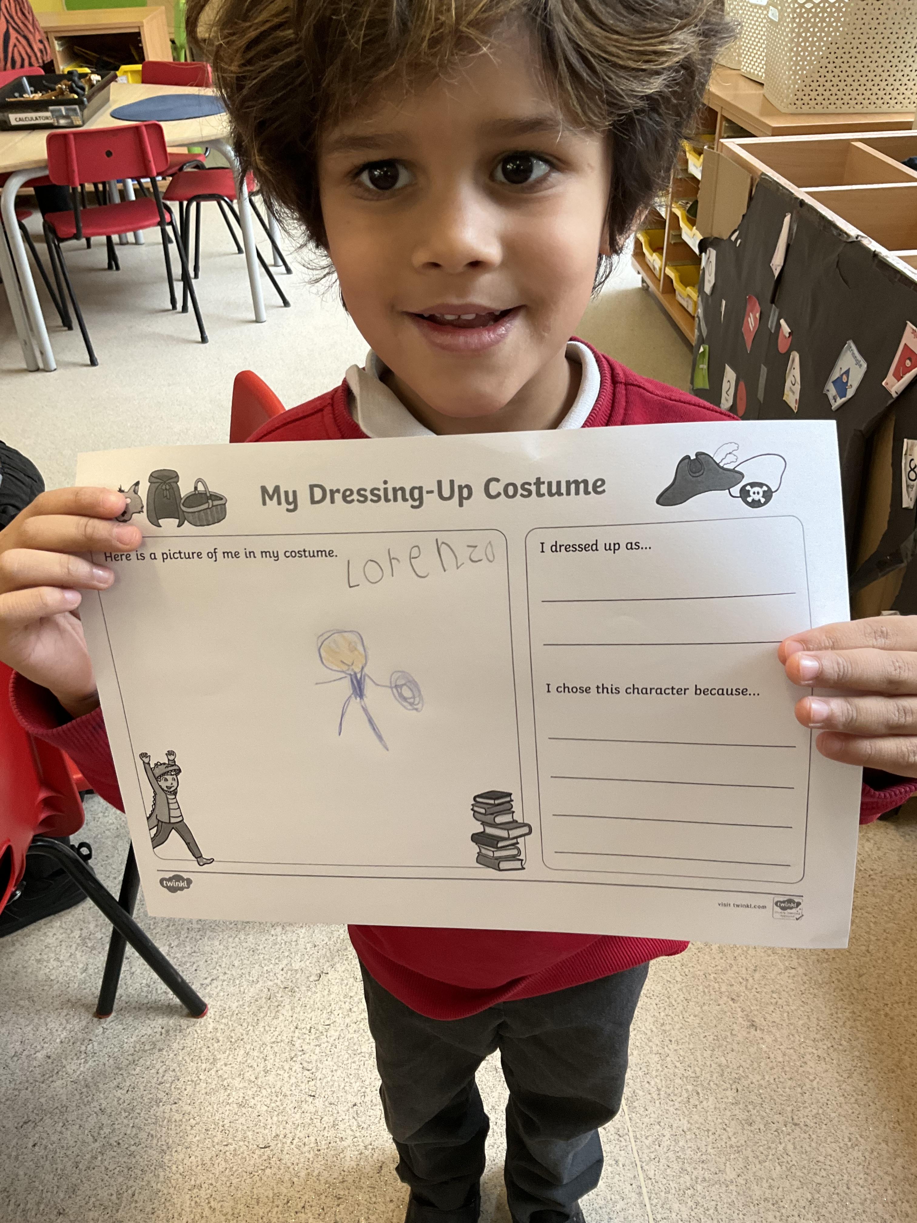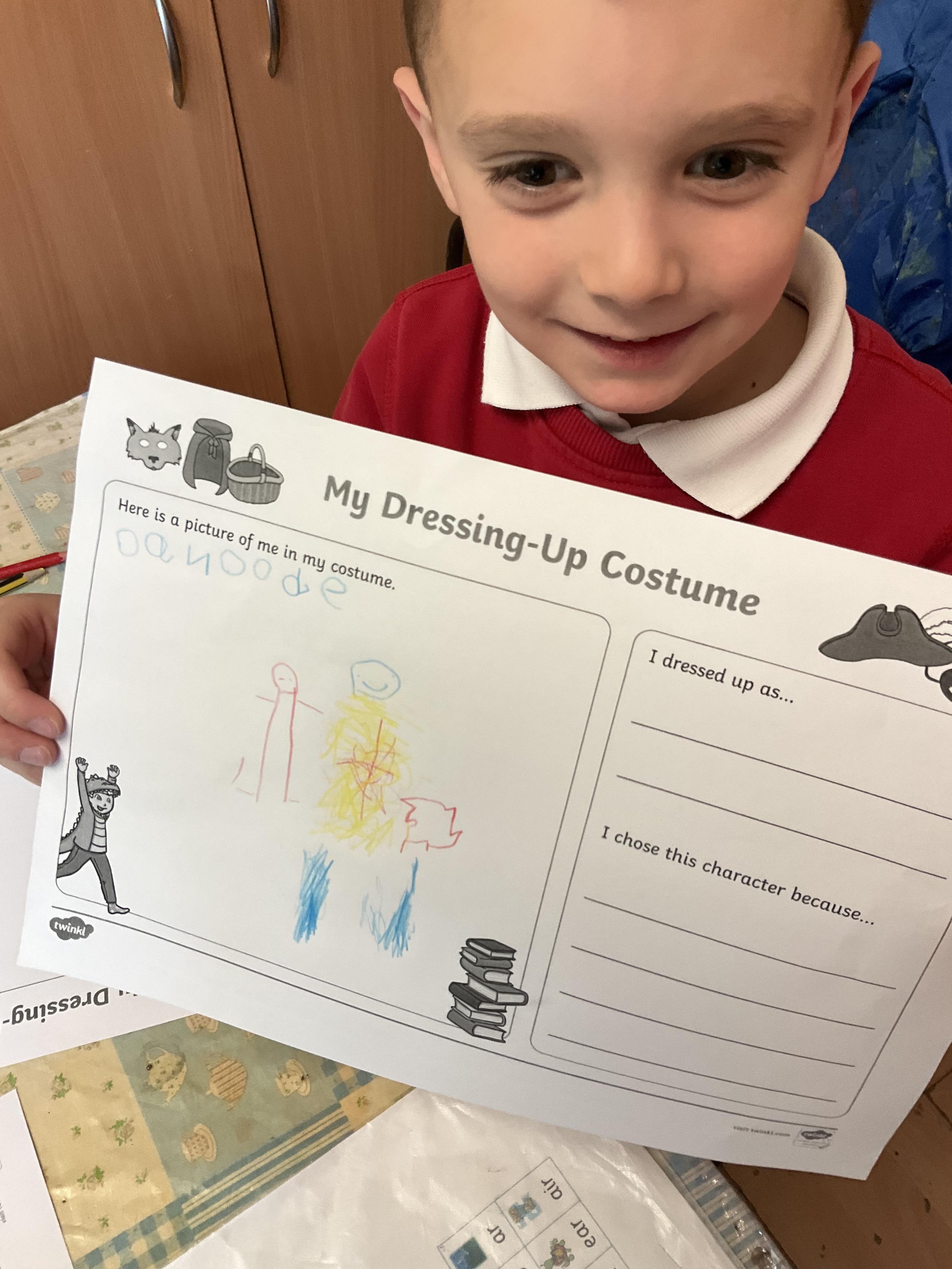 The next day the chidlren drew of a picture of the character they dressed up as. They then treid to use their phonics to write the name of their character.