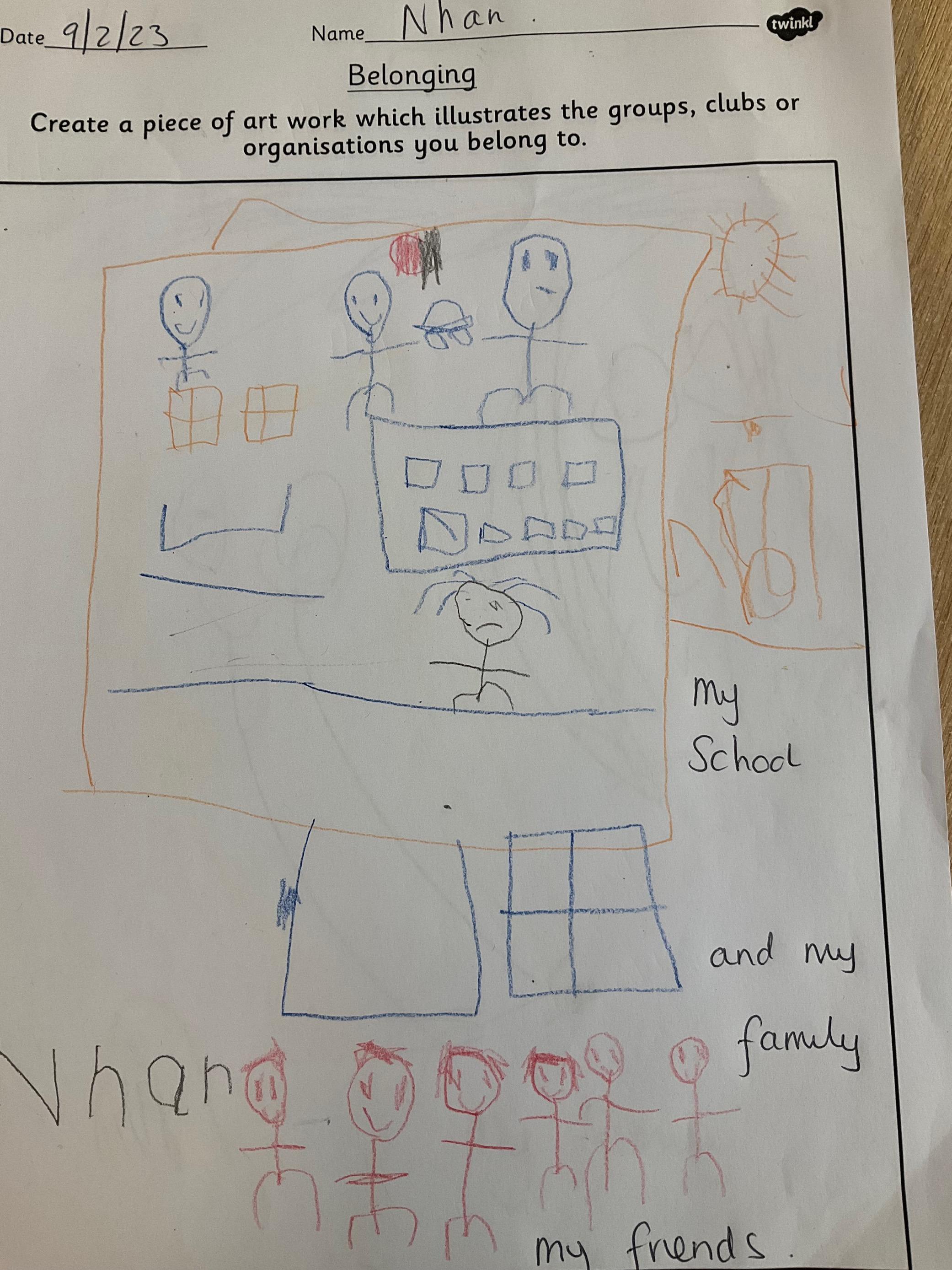 RE DAY Thursday 9th Feb. We talked about the different groups we belong to and how we can tell what group someone belongs to because of the clothes they wear like our school uniform. We drew pictures to show what groups we belonged to and who in lives in our house.