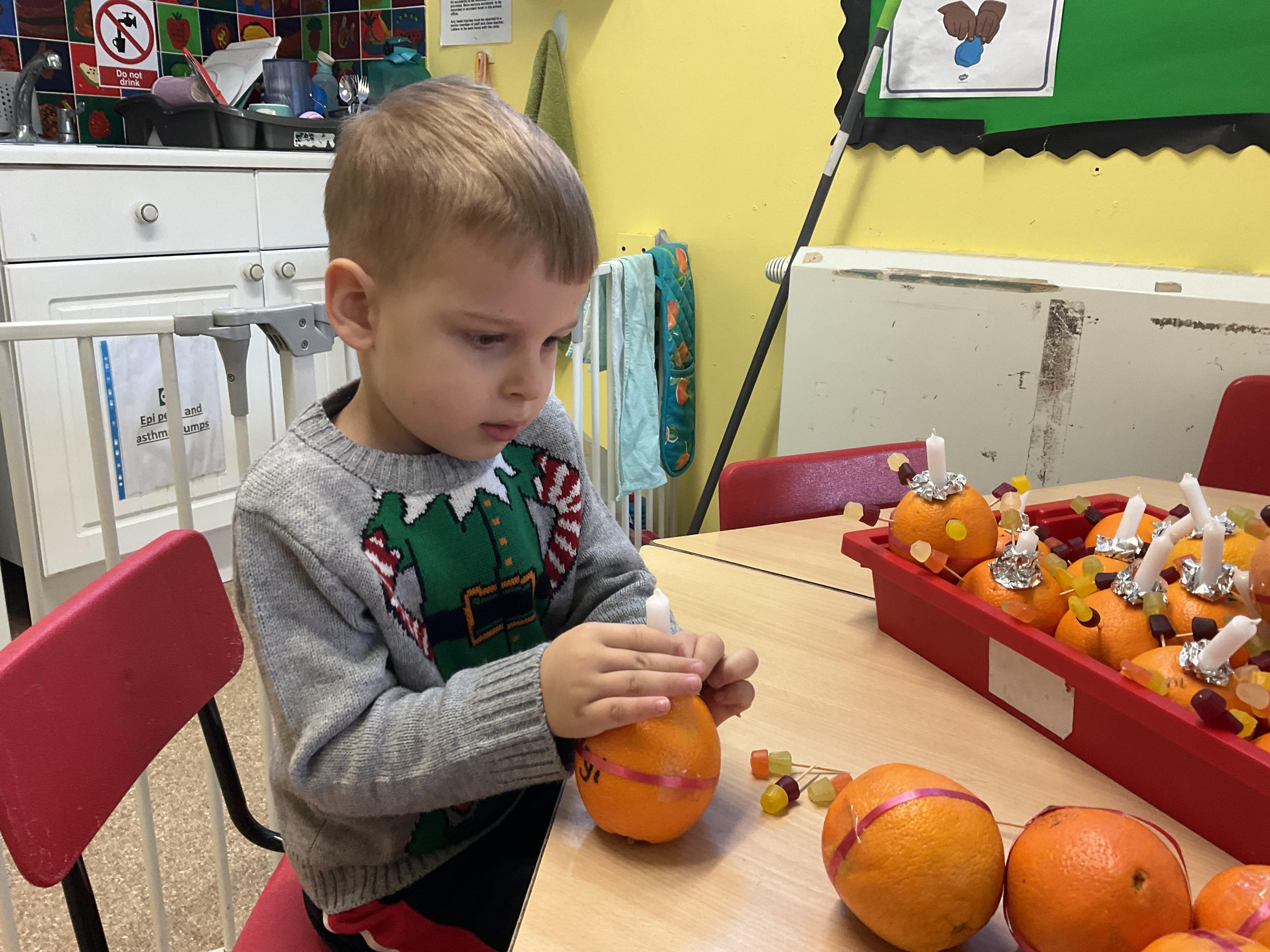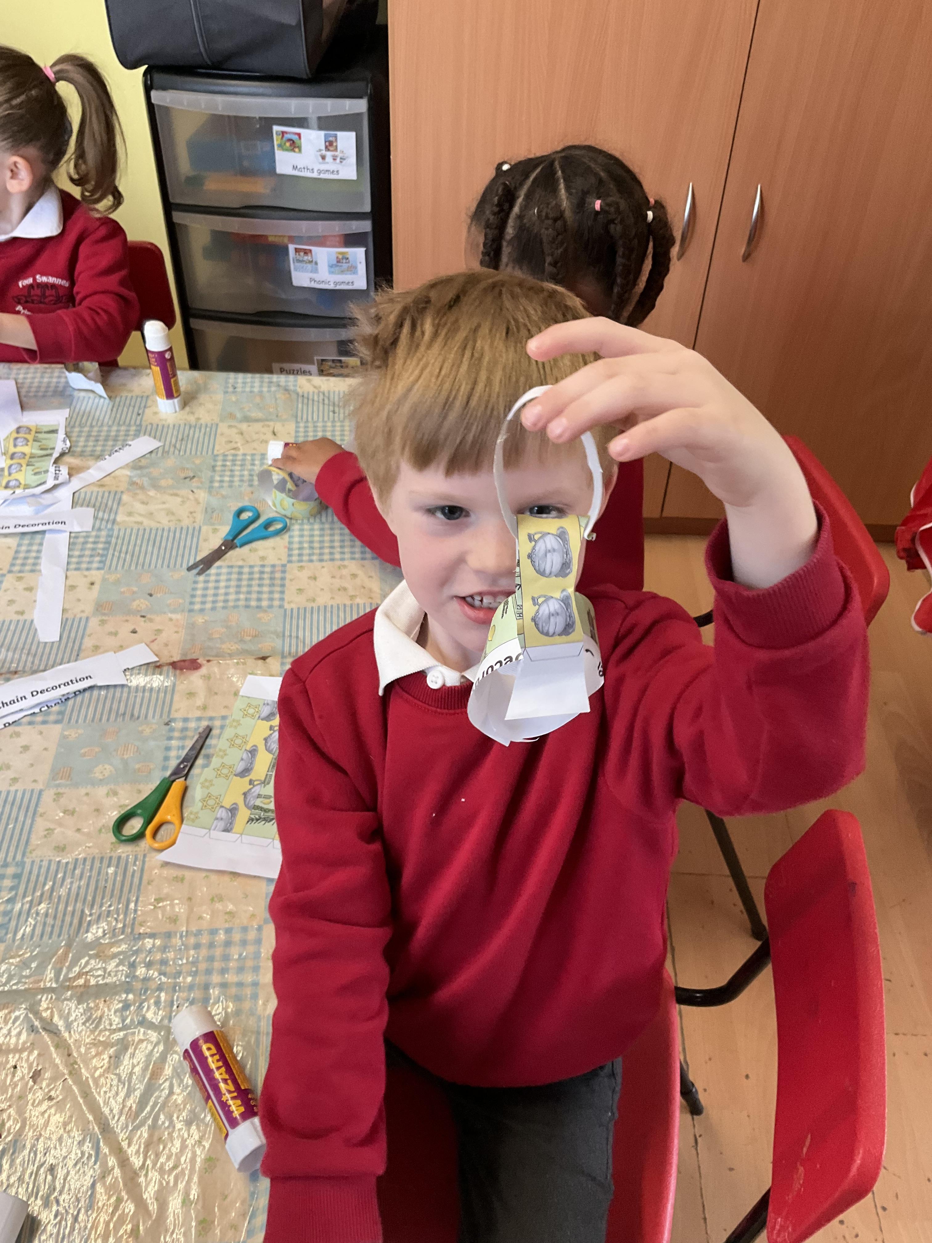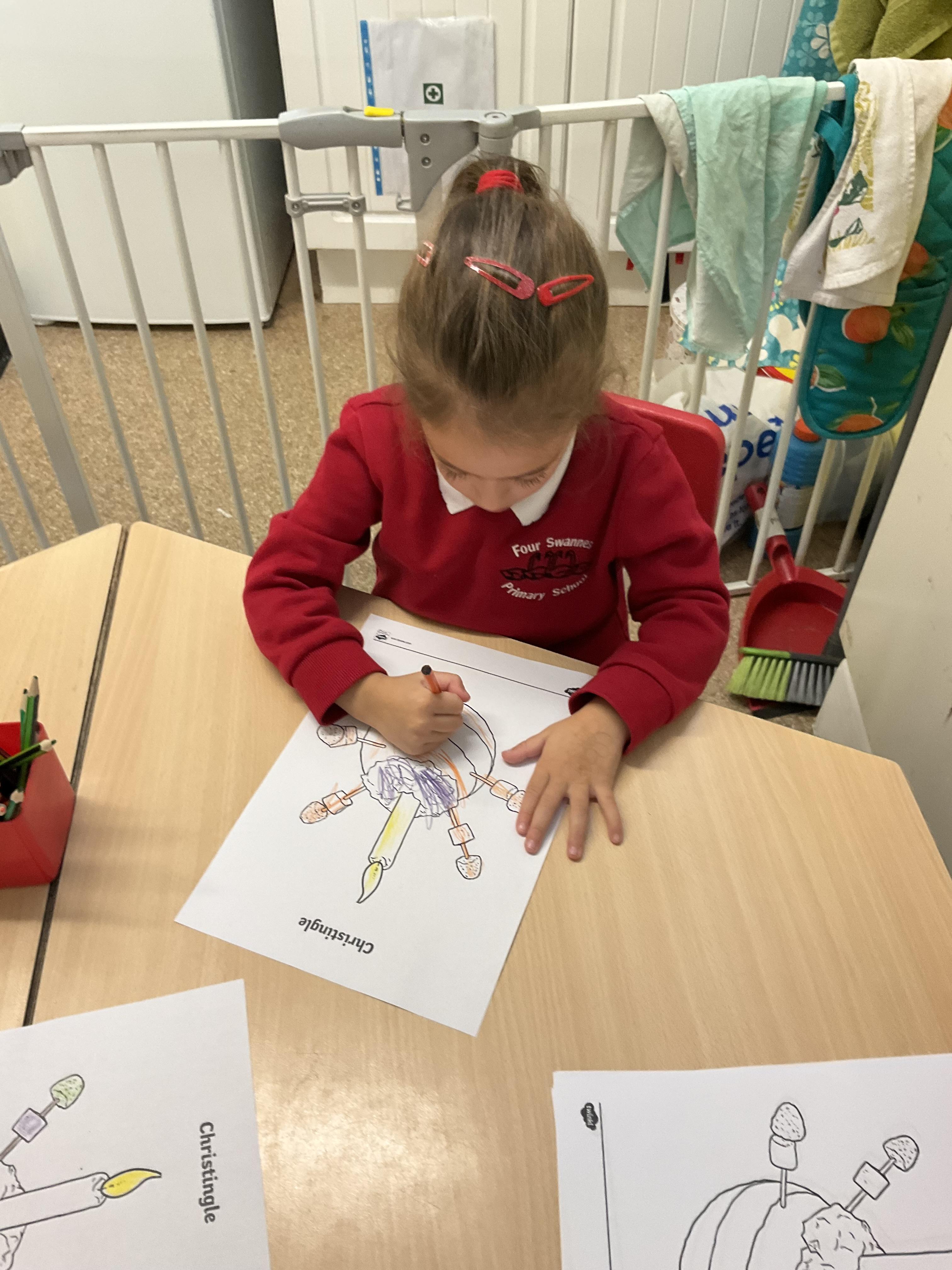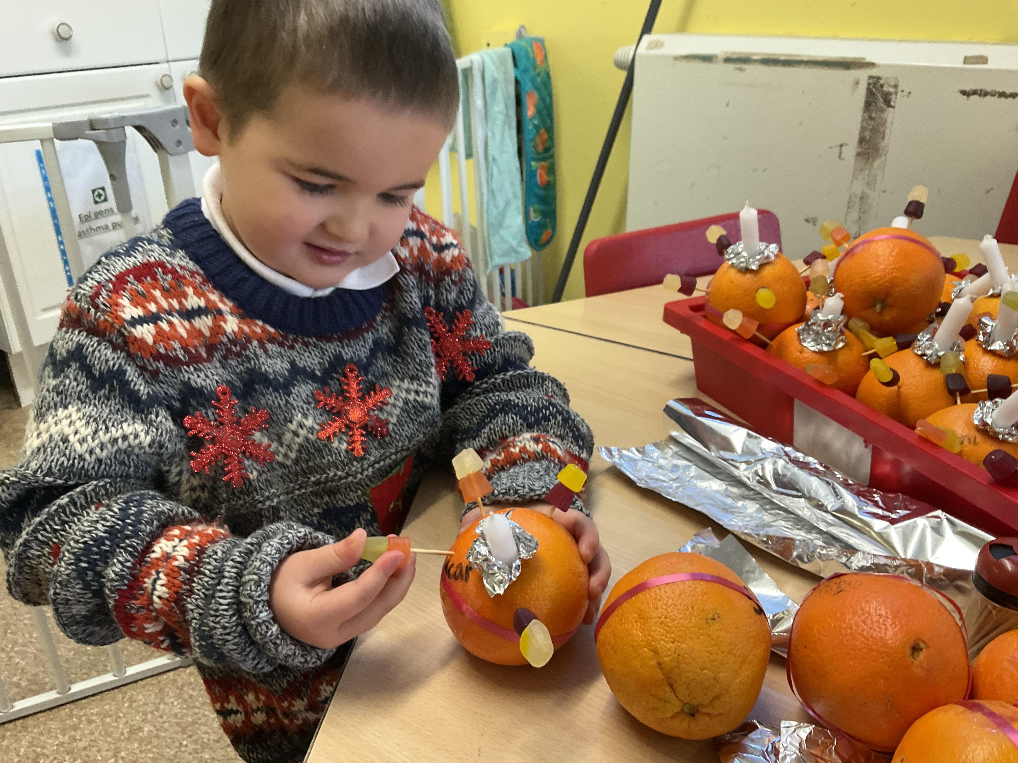 This week the children have been preparing for the Christmas fair. They have been busy making reindeer food and a christmas ornament for their christmas tree. The children have also been listening to christmas music and taking part in christmas maths. They have been busy decorating a christmas tree on the computer. The children have also been busy making a Christingle ready for the Christingle service and enjoyed Christmas dinner on Christmas jumper day. They have been busy making a christmas party hat to wear whilst having their Christmas dinner.