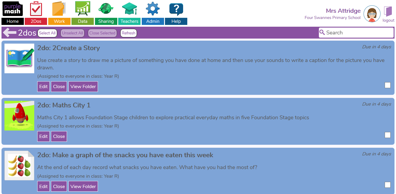 This week I have set four tasks on the 2do list on Purple Mash. Please use your log in that was sent to you the other day. I will be able to see what tasks you have done. Also if you go in to mini mash don't forget to save anything you do in your tray, just like when we are in school. I hope you are all keeping up with your reading on the oxford owl site.