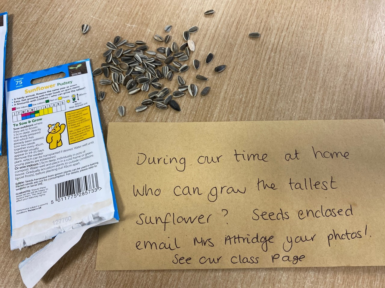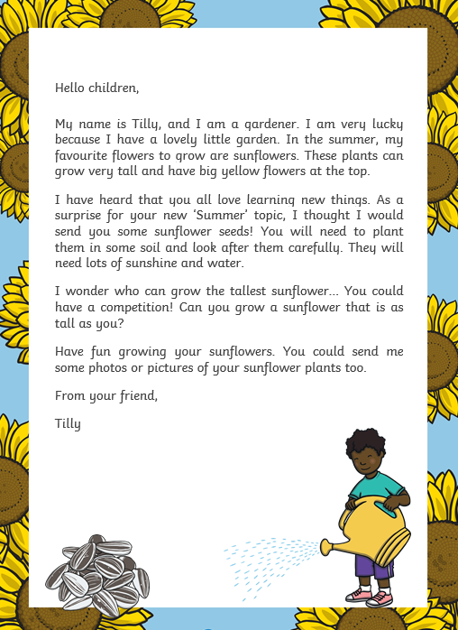 This week our class received a letter from Tilly the gardener asking us to grow some Sunflowers. She left us a packet of Sunflower seeds and asked us to see who could grow the tallest Sunflower.