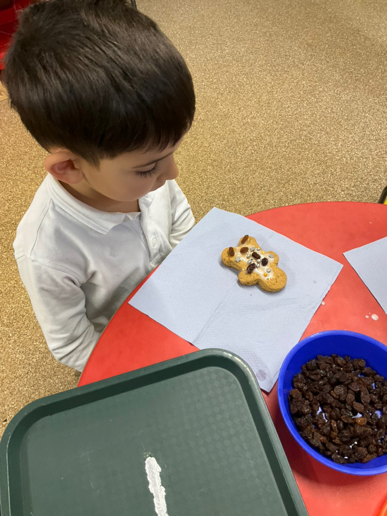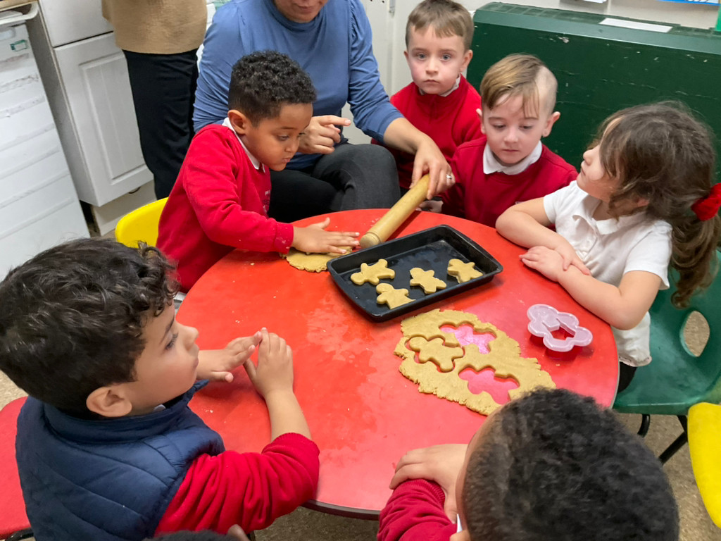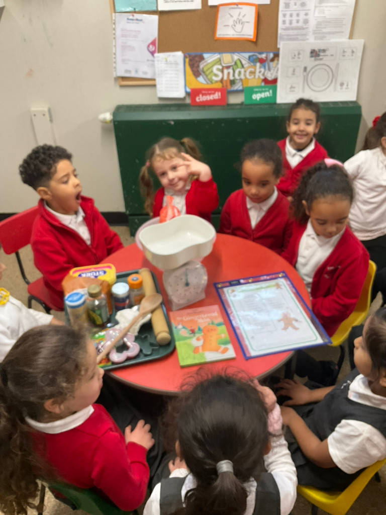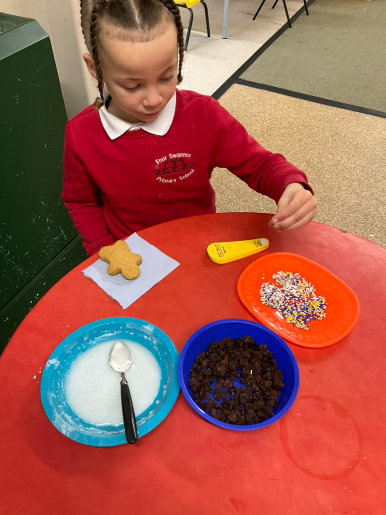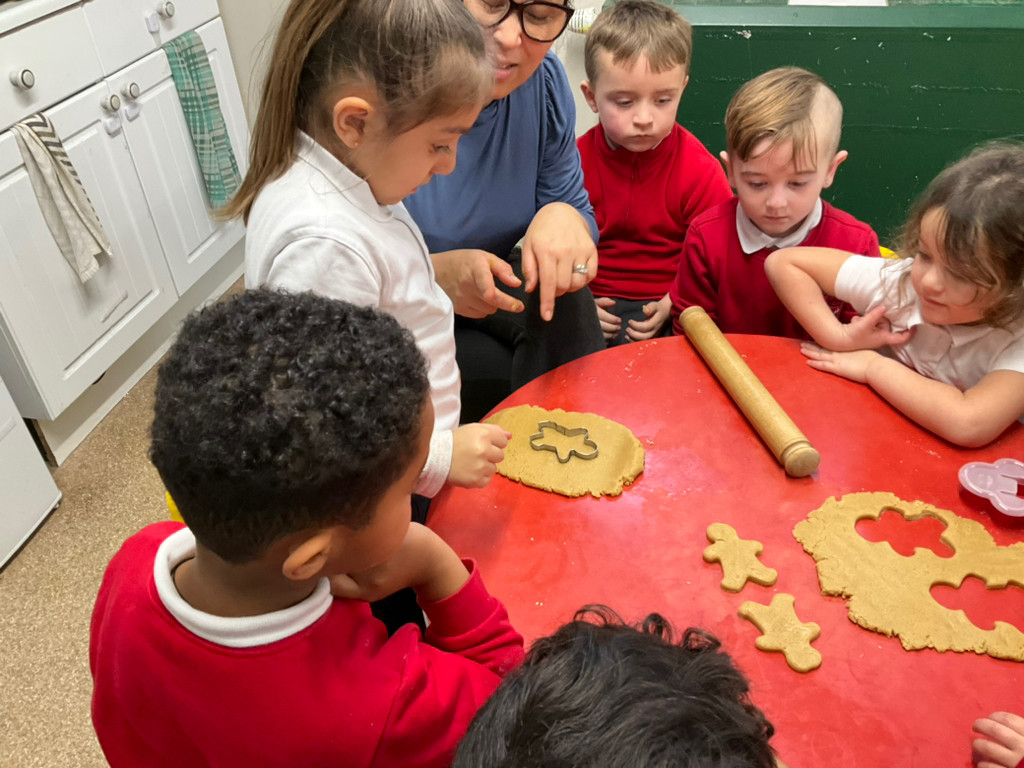 After reading the book The Gingerbread Man, the children baked their own gingerbread men using plain flour, butter, ginger powder, egg, brown sugar and golden syrup. They used their Maths skills to carefully measure the ingredients and their English skills to read and follow the recipe. The children took turns kindly and shared the resources well. They described the smell of the gingerbread as gingery, delicious and tasty. The children developed their fine motor skills as they mixed the ingredients together, rolled out the dough and carefully cut around the gingerbread man shapes. They then used icing sugar, decorations and raisins to decorate their gingerbread men. The children thoroughly enjoyed the activity and were very proud to eat their finished products.