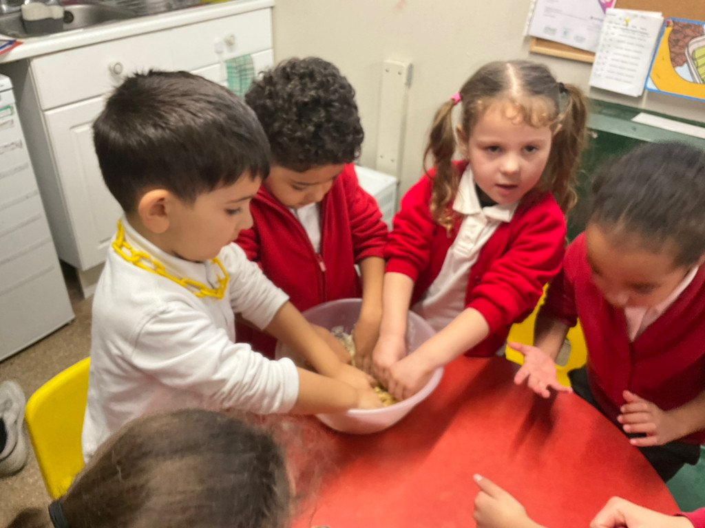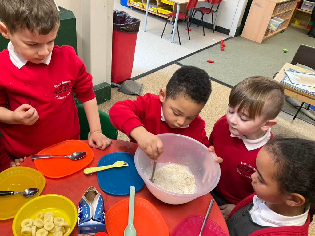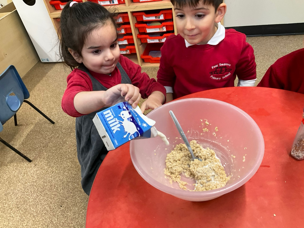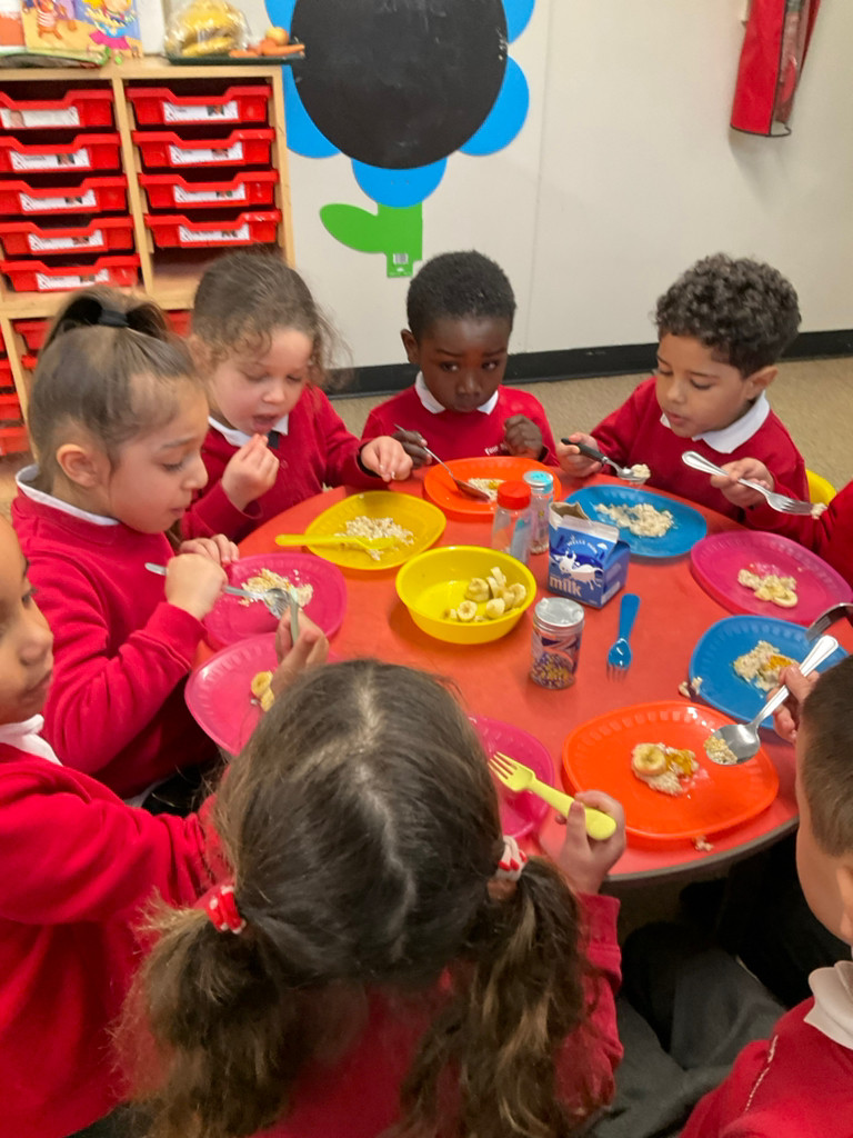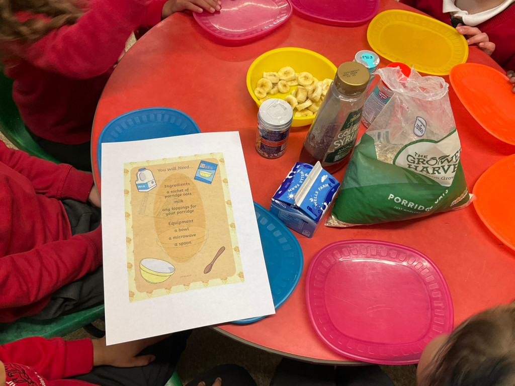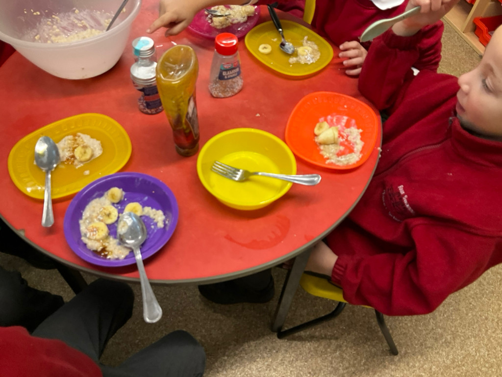 As our book this week was Goldilocks and the Three Bears, the children took part in cooking porridge. They explored the oats before cooking, feeling the texture and describing them as flaky and dry. After adding warm water to the oats, the children mixed them together before cooking the porridge in the microwave for 30 seconds. Once cooked, they observed the changes and described the porridge as thick, lumpy, and soft. We then added milk and mixed it well. Finally, the children chose their own toppings and enjoyed eating their delicious porridge.