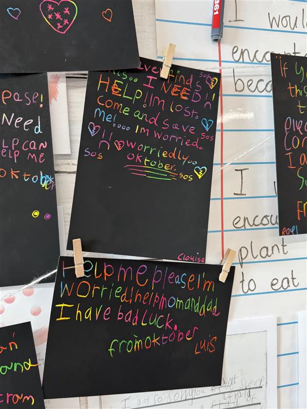 This week as we adventured deeper into our book The Wilderness, poor Oktober got LOST! Year 3 used urgency in their writing to convey how scared he was by writing S.O.S notes!