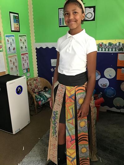 The class has begun preparation for Sports Day and has been in lively form, hitting targets, balancing eggs and scoring goals. Another recent highlight has been reliving Galileo's flabbergasting discovering that air-resistance and not weight determines the rate that an object falls to the ground (the children establish this by dropping paper folded into different sizes). Statistics has been an engaging new topic in Maths; the class have made thoughtful interpretations of line graphs and tables. In the photos, however, I have chosen to emphasise the children's lovely art work- based on African patterns- whereby we combined colourfully decorated card strips to make a skirt.