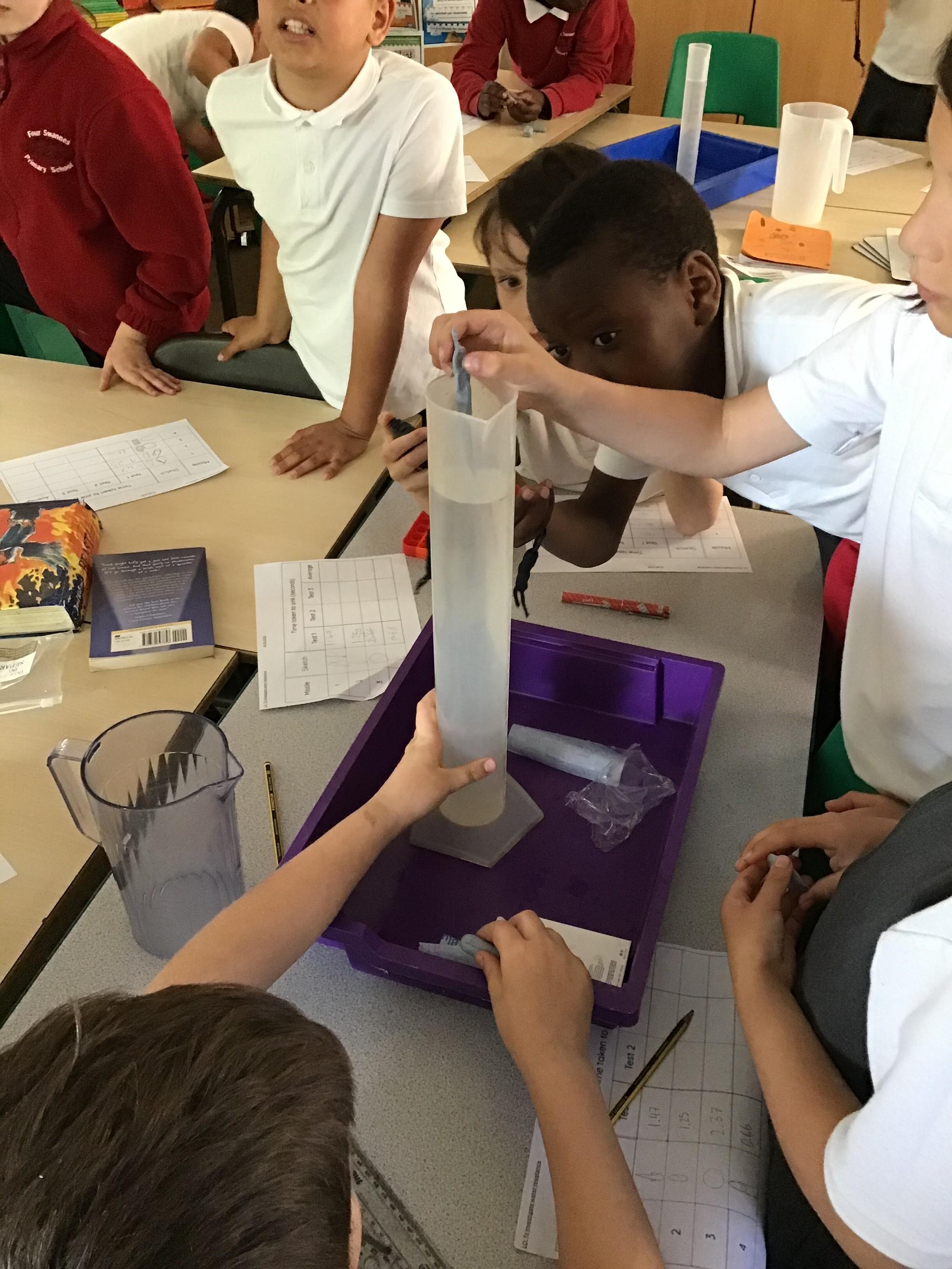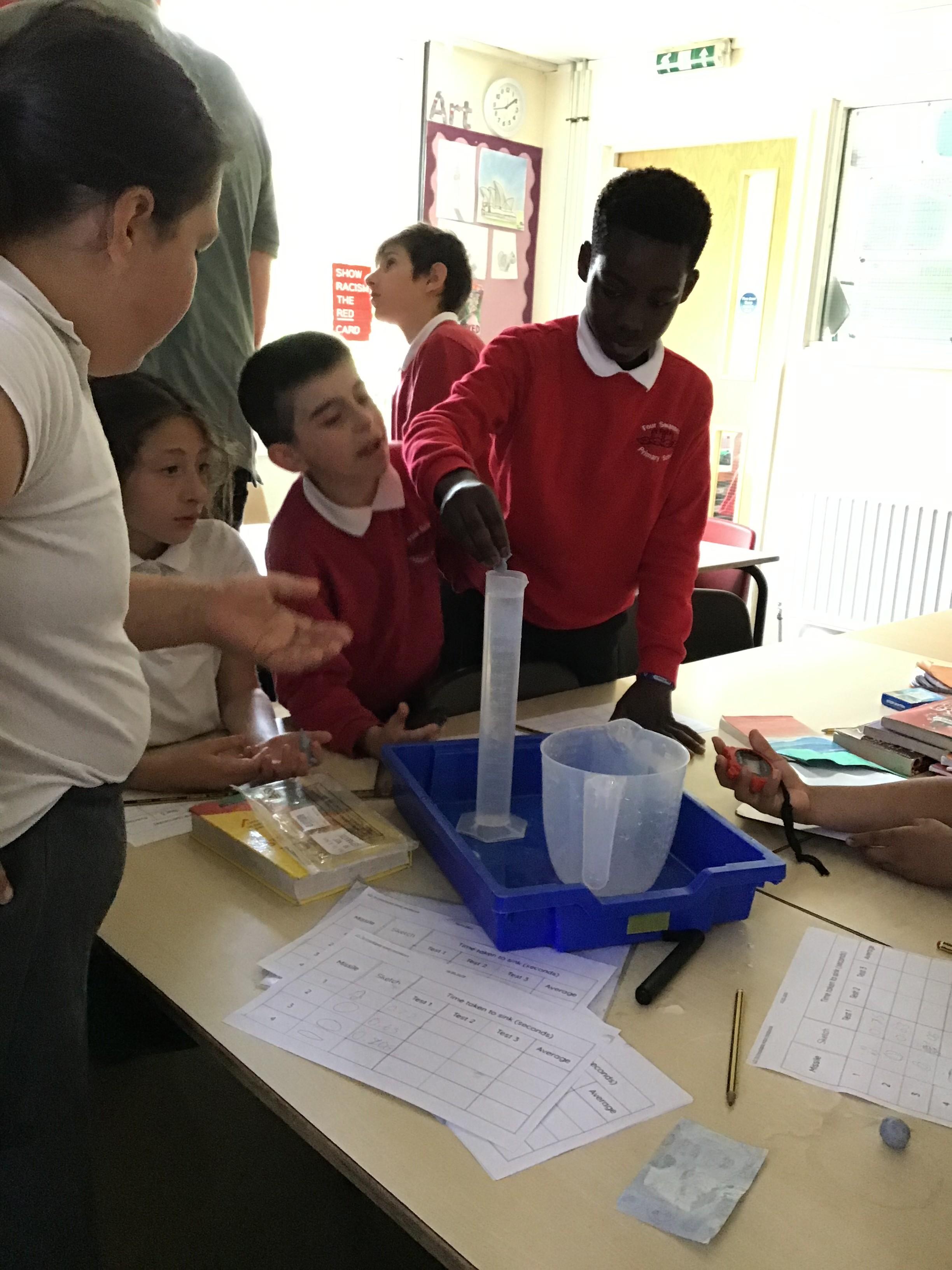 To select two understanding events of the week: the children enjoyed a special football-themed PE lesson (delivered by an expert coach). While this wasn't photographed, we have a few particularly stylish Year 5 footballers playing at the after school club to make up for it (see below). Another stand out was our science investigation, in which the children tested the speed it took a variety of blue-tac missiles to pass through water in order to investigate water resistance. They observed carefully and used stop watches, as can be seen below.