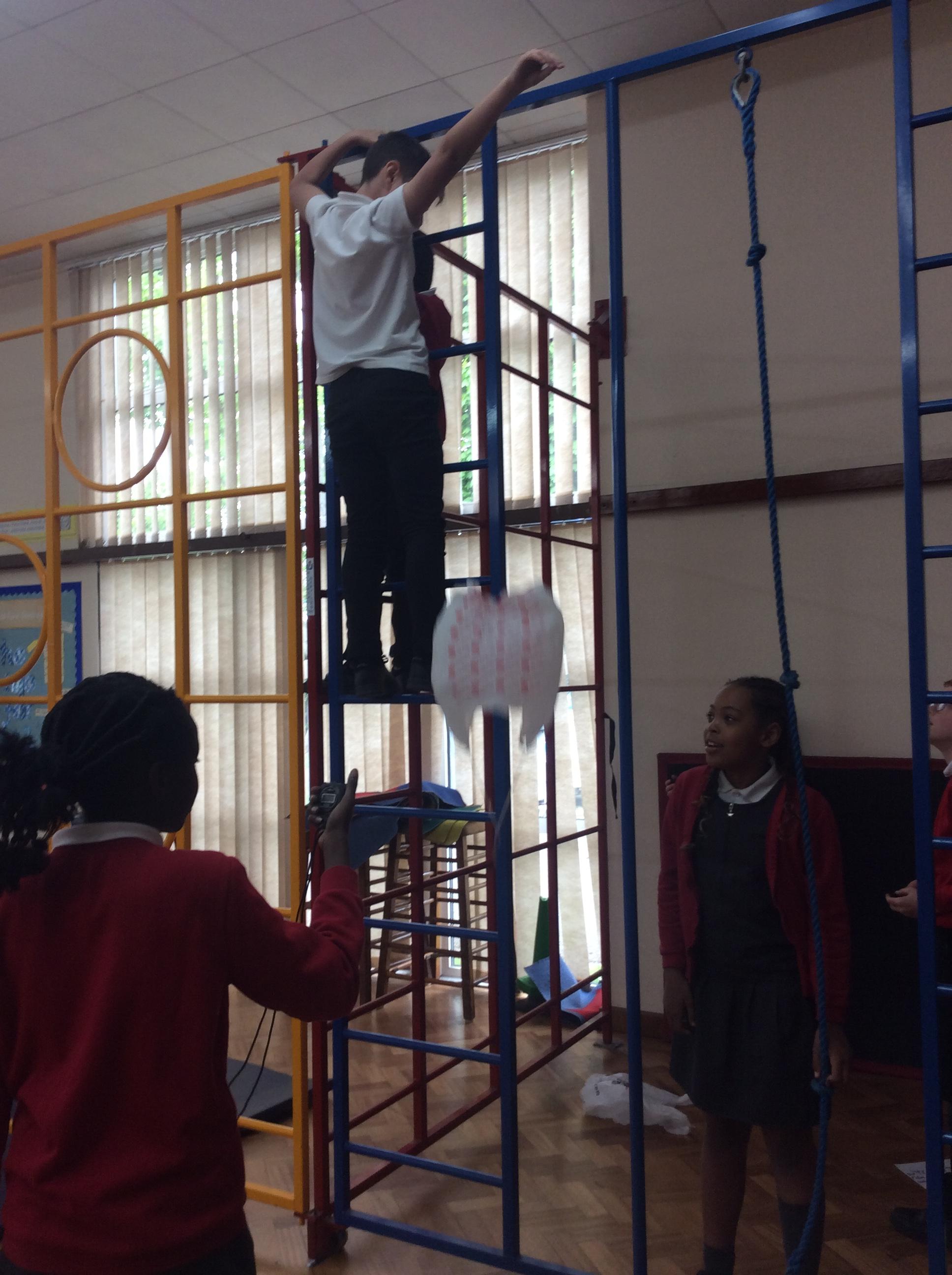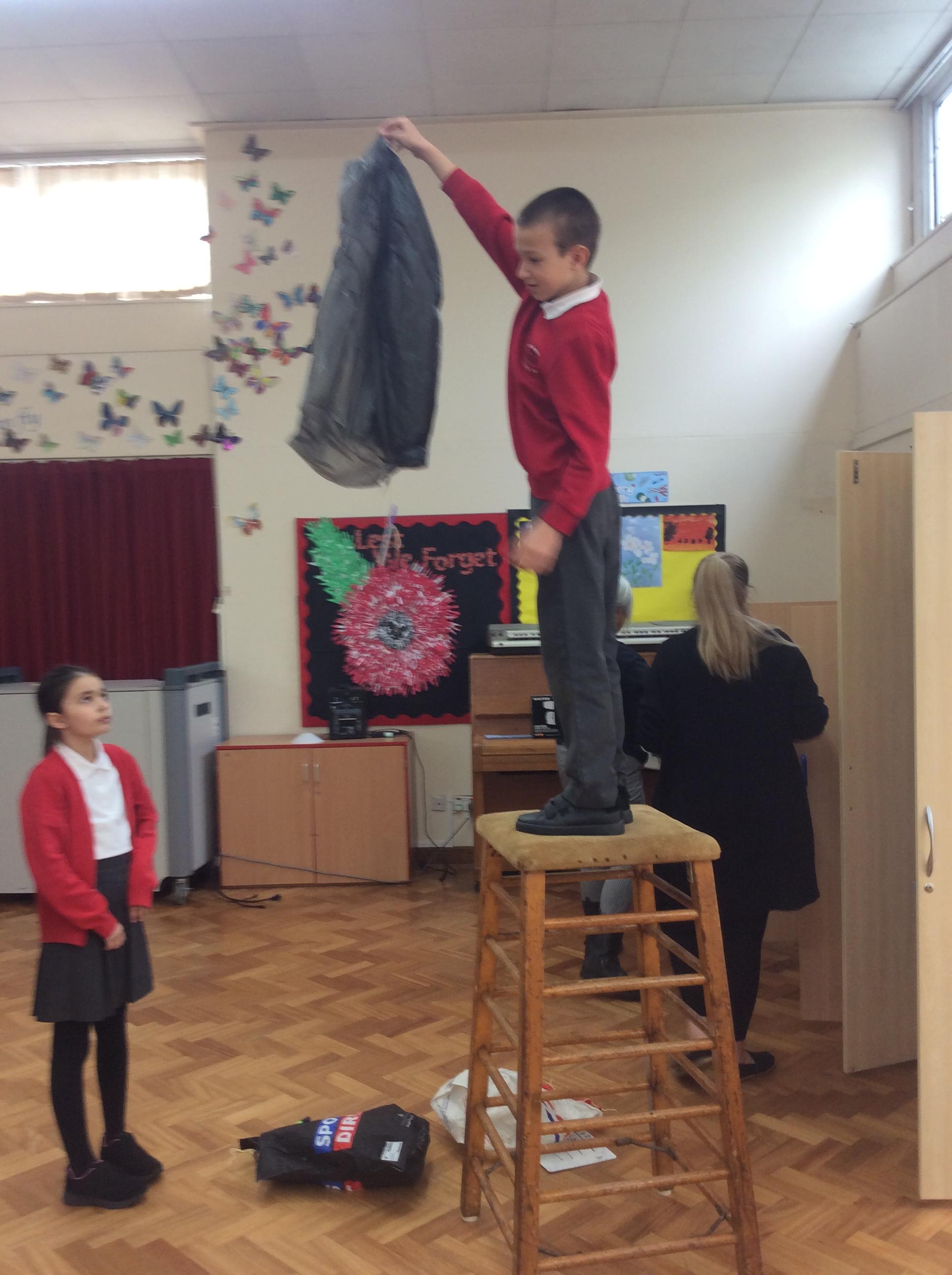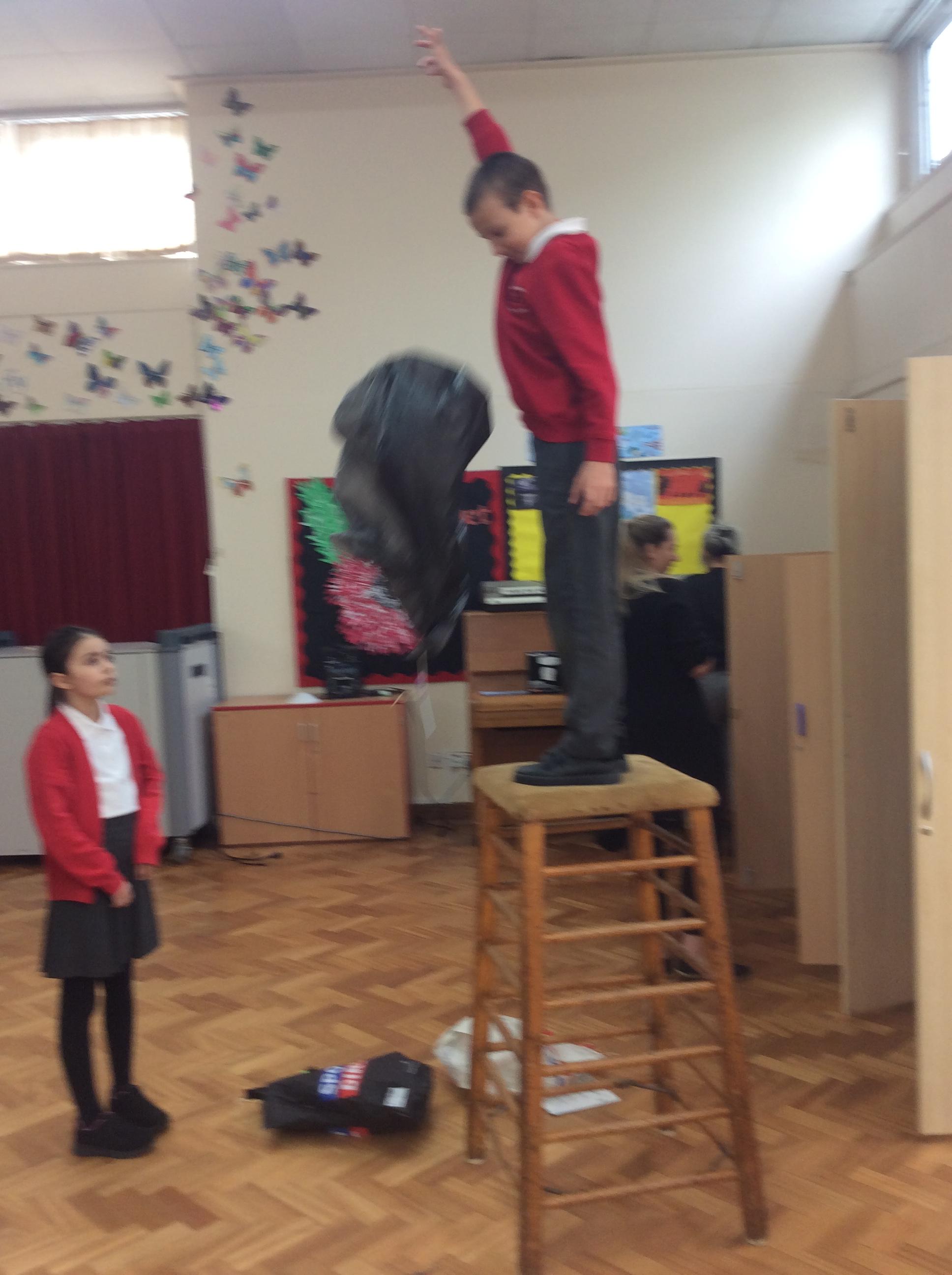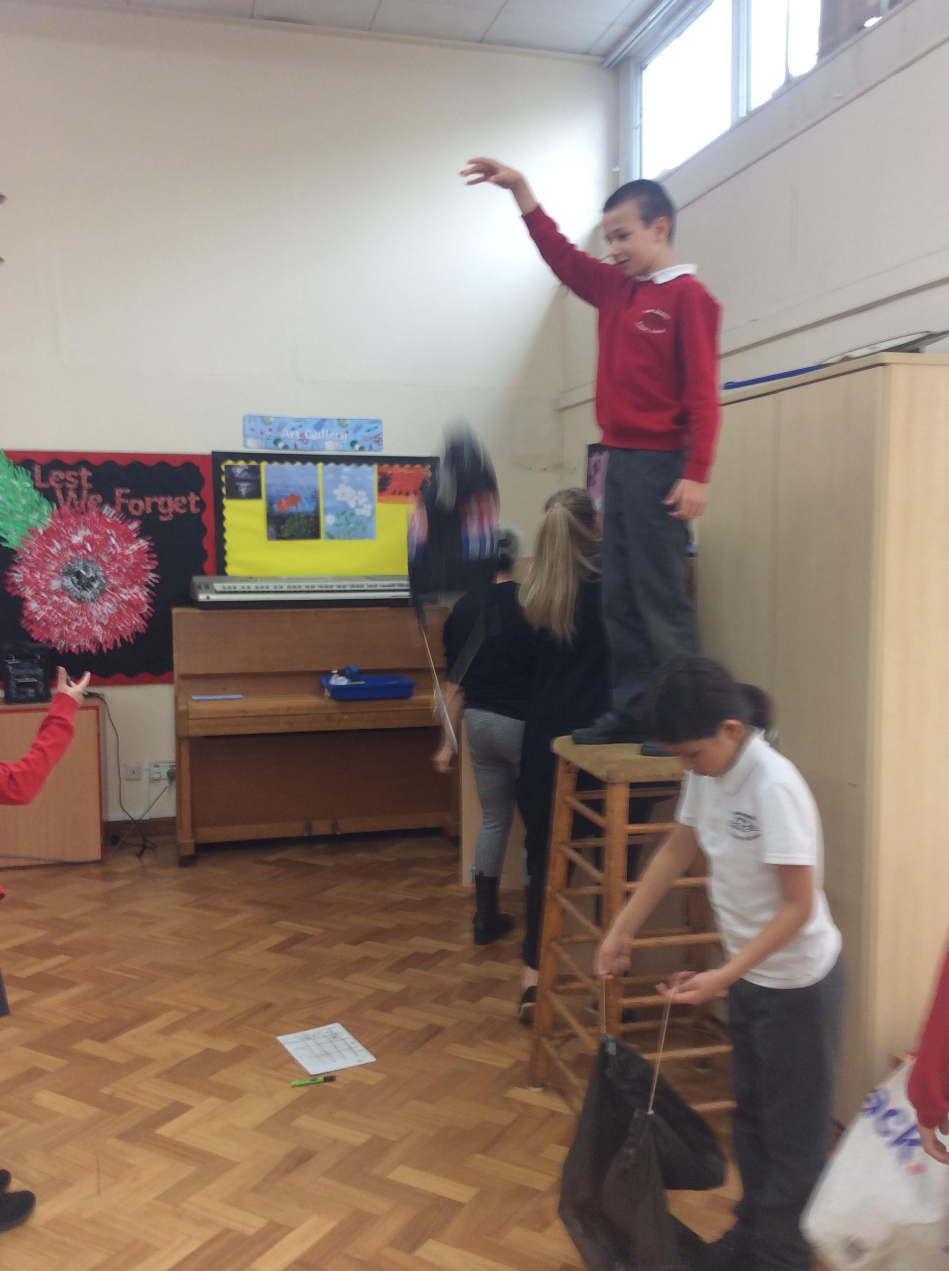In Science this term, our topic is forces. This week we were investigating what can effect air resistance. In groups, we were dropping parachutes from a set height and seeing what can affect the speed. The variables we investigated were the size of the parachute, the length of the string and the material of the parachute. We will be presenting and discussing our findings next week.