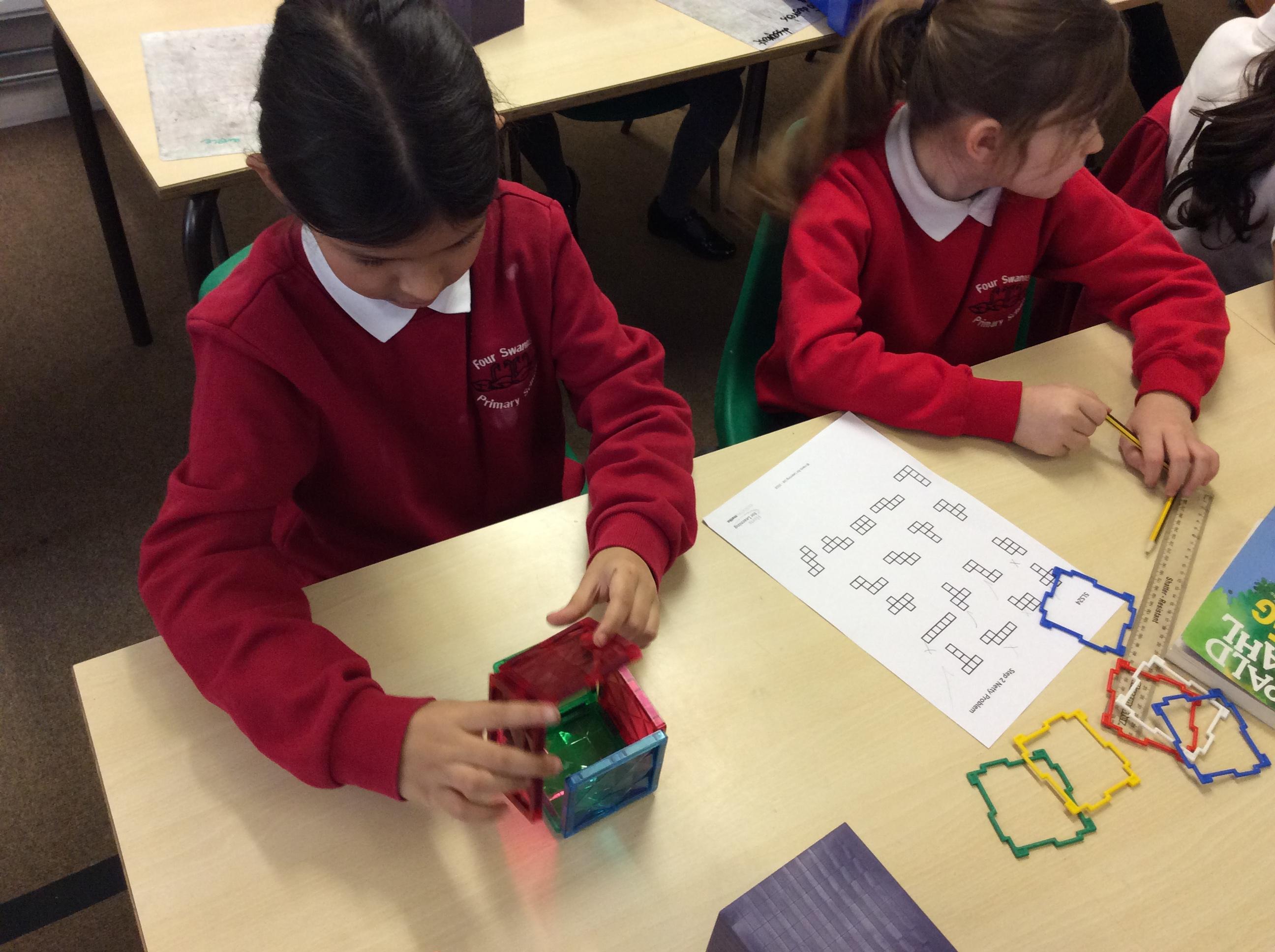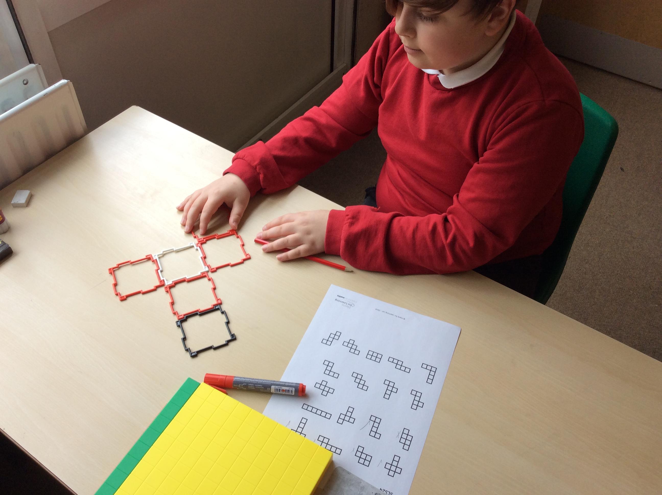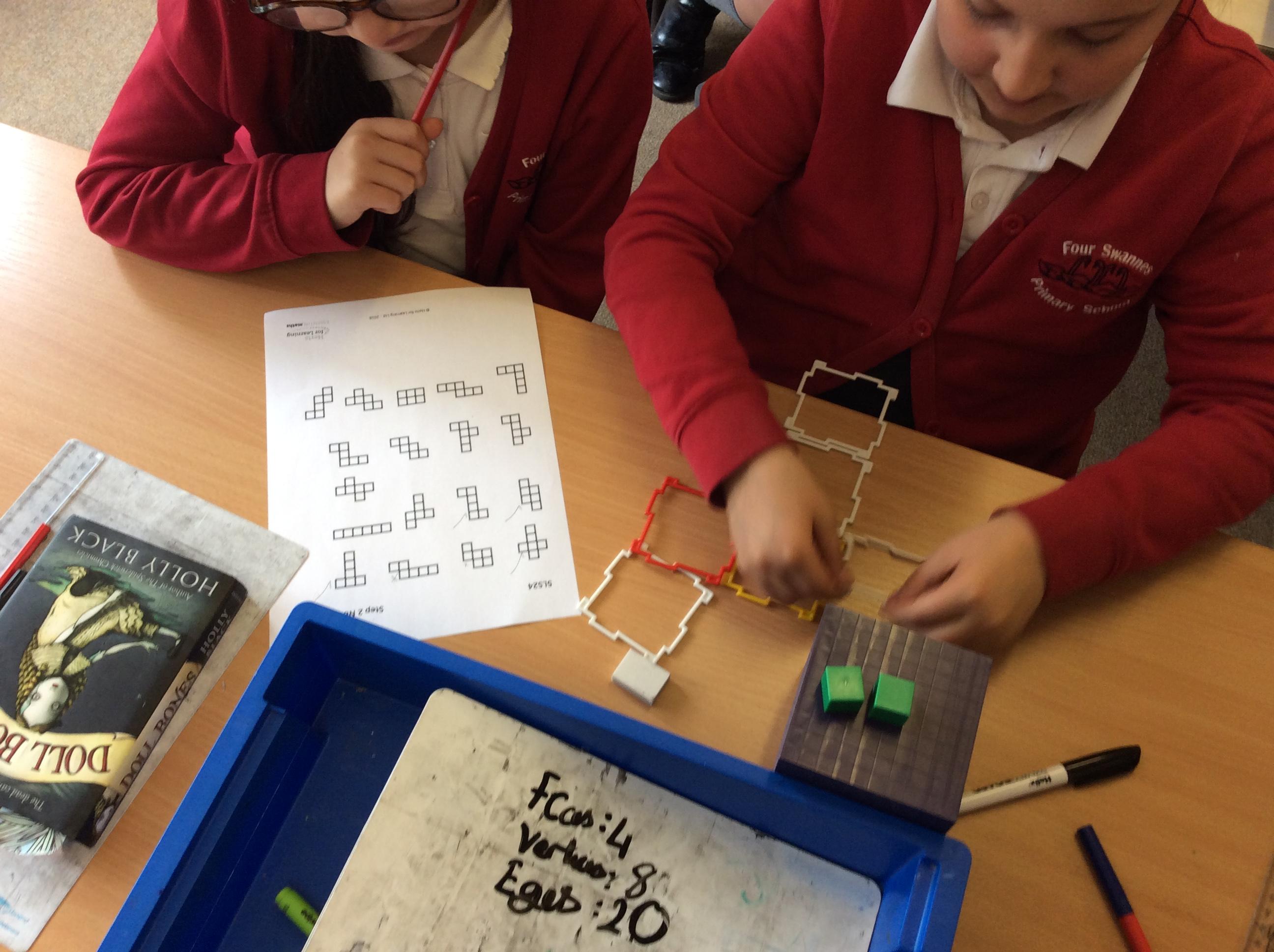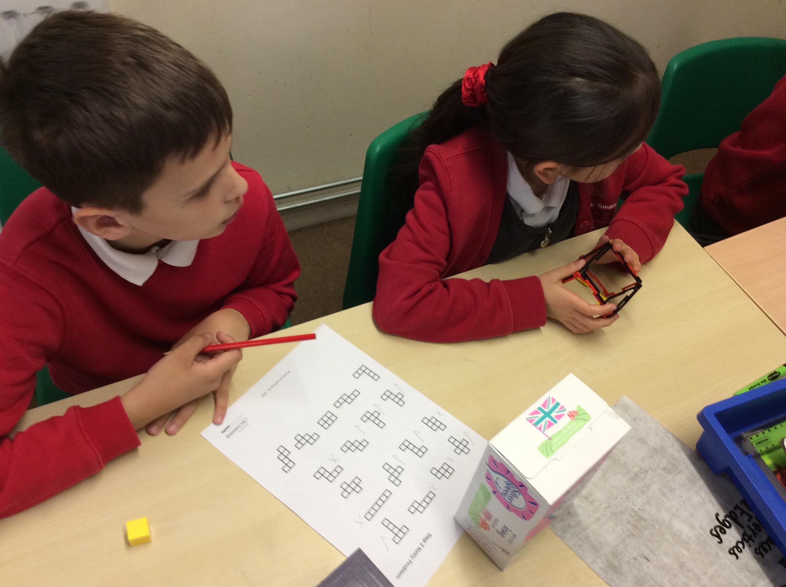In Maths this week, we have been focusing on shape and looking at nets. We used apparatus to investigate which nets made a cube and which didn't. From this, we were able to reason as to what properties were needed to make the net of a cube.