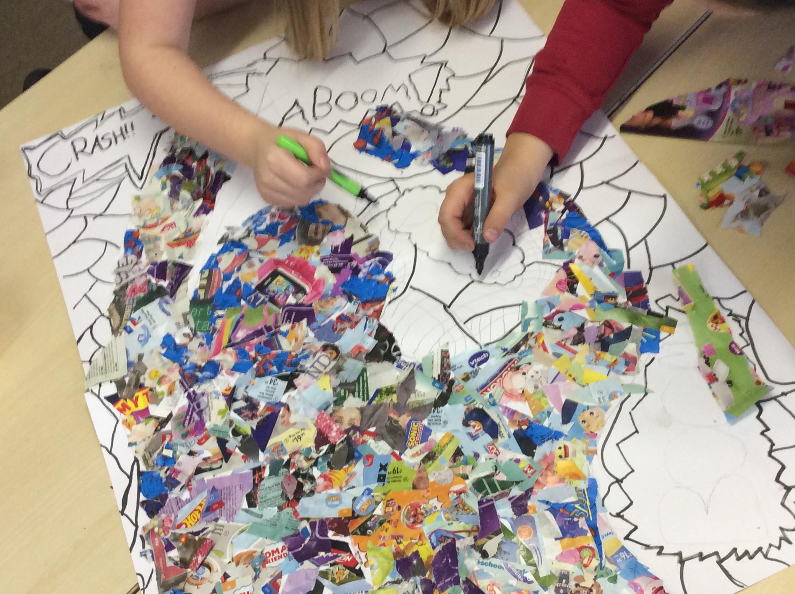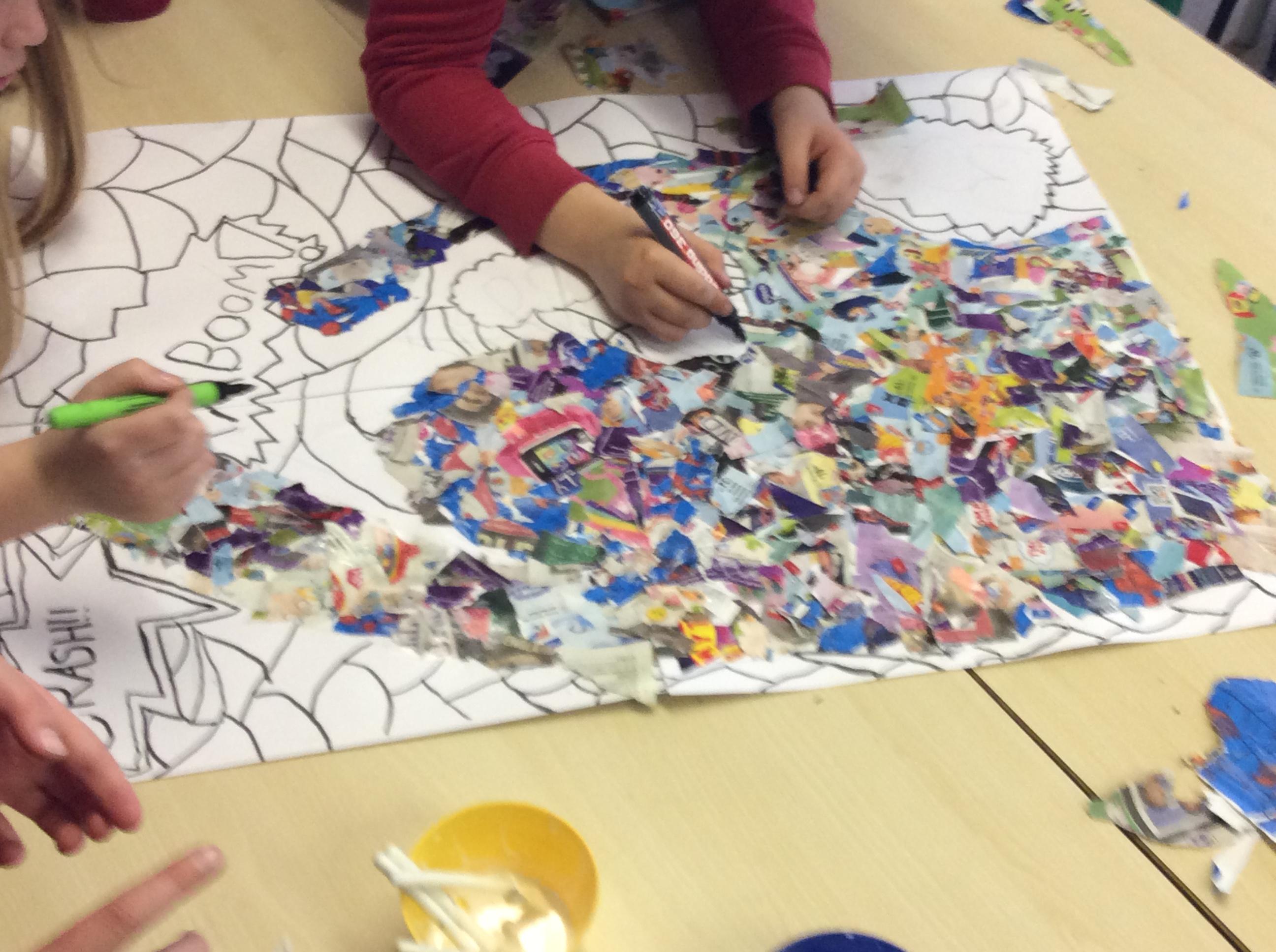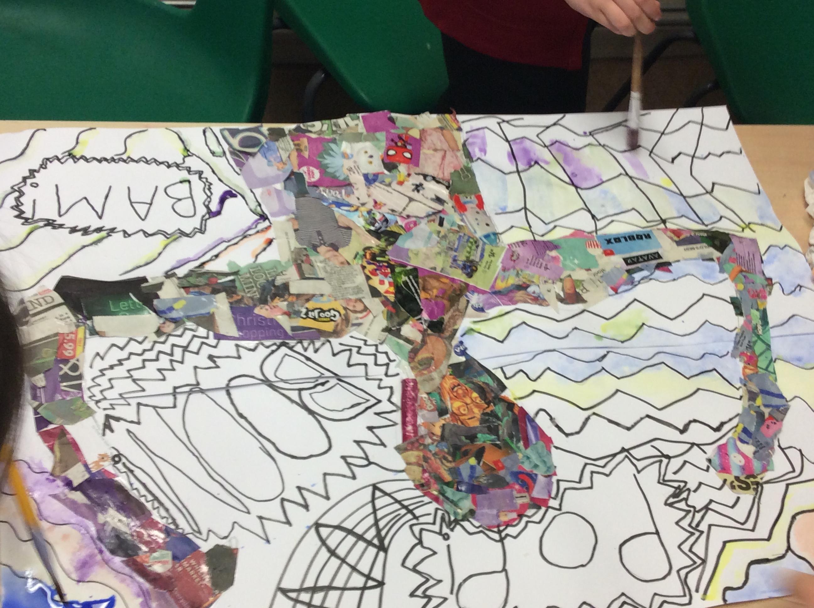 This week in Art, we continued to work on our collaborative Pop Art pieces. We used collage to complete our superhero outlines, we then went over the background with a wash before completing the pieces using a pointillism technique.