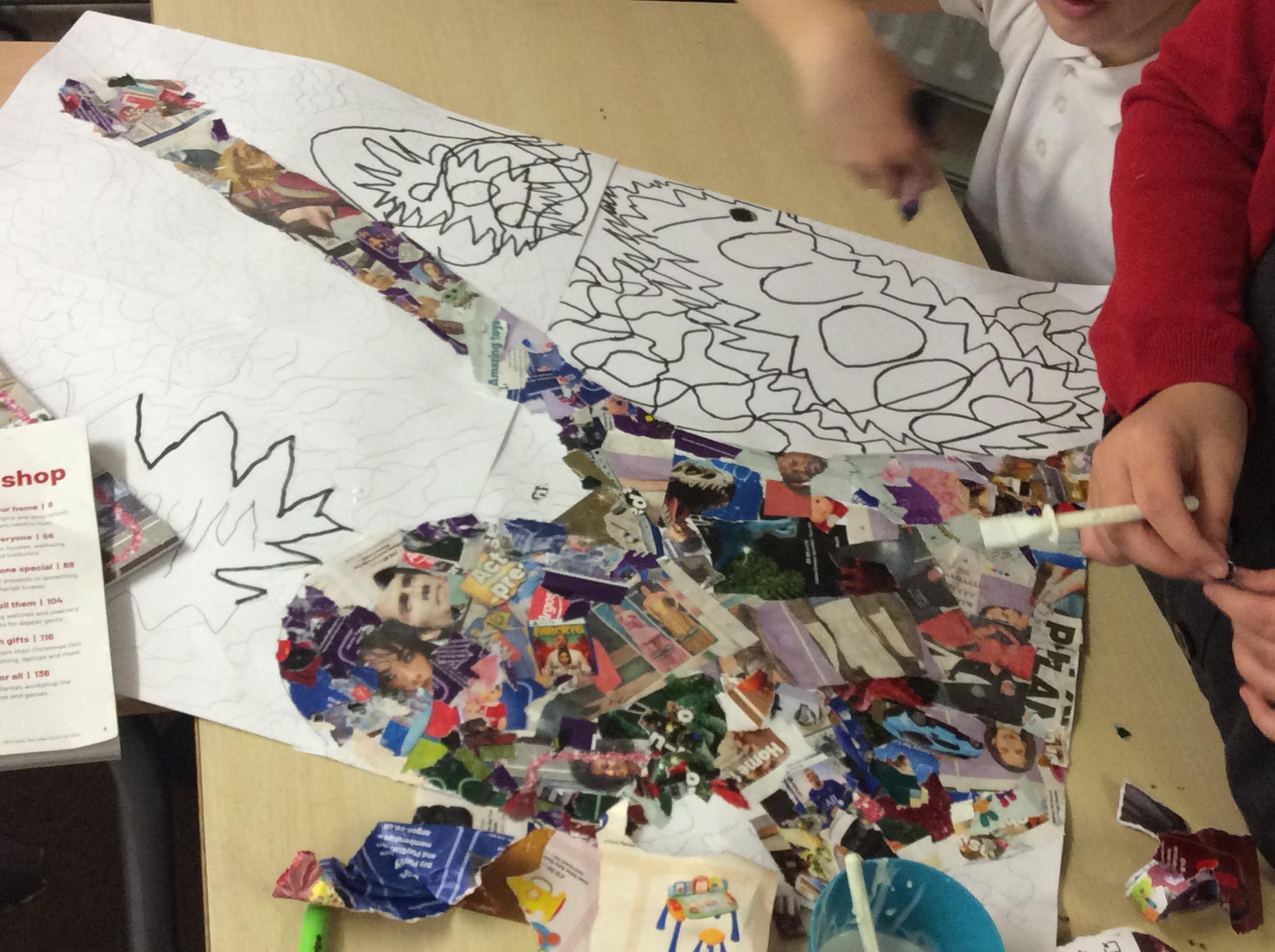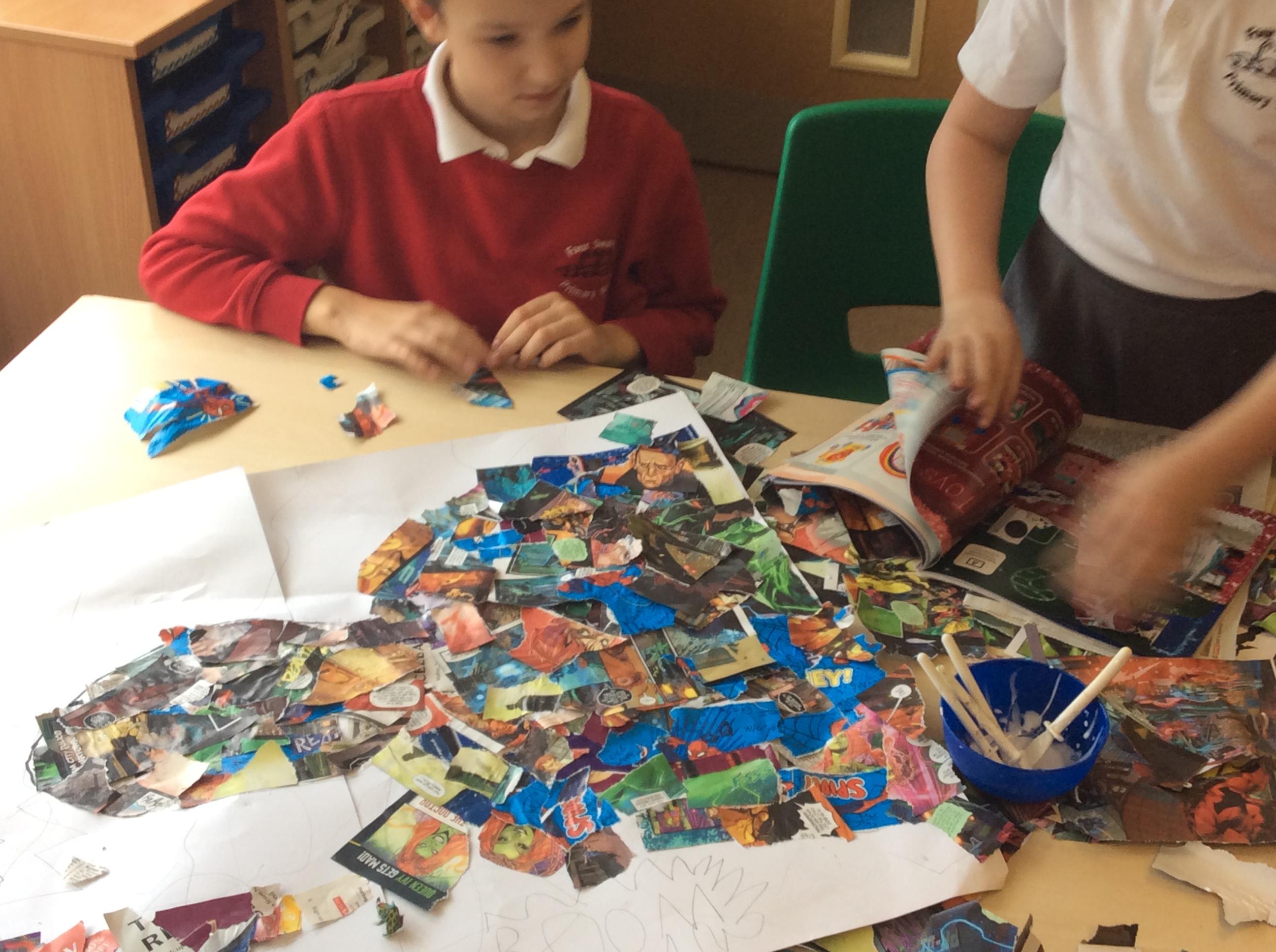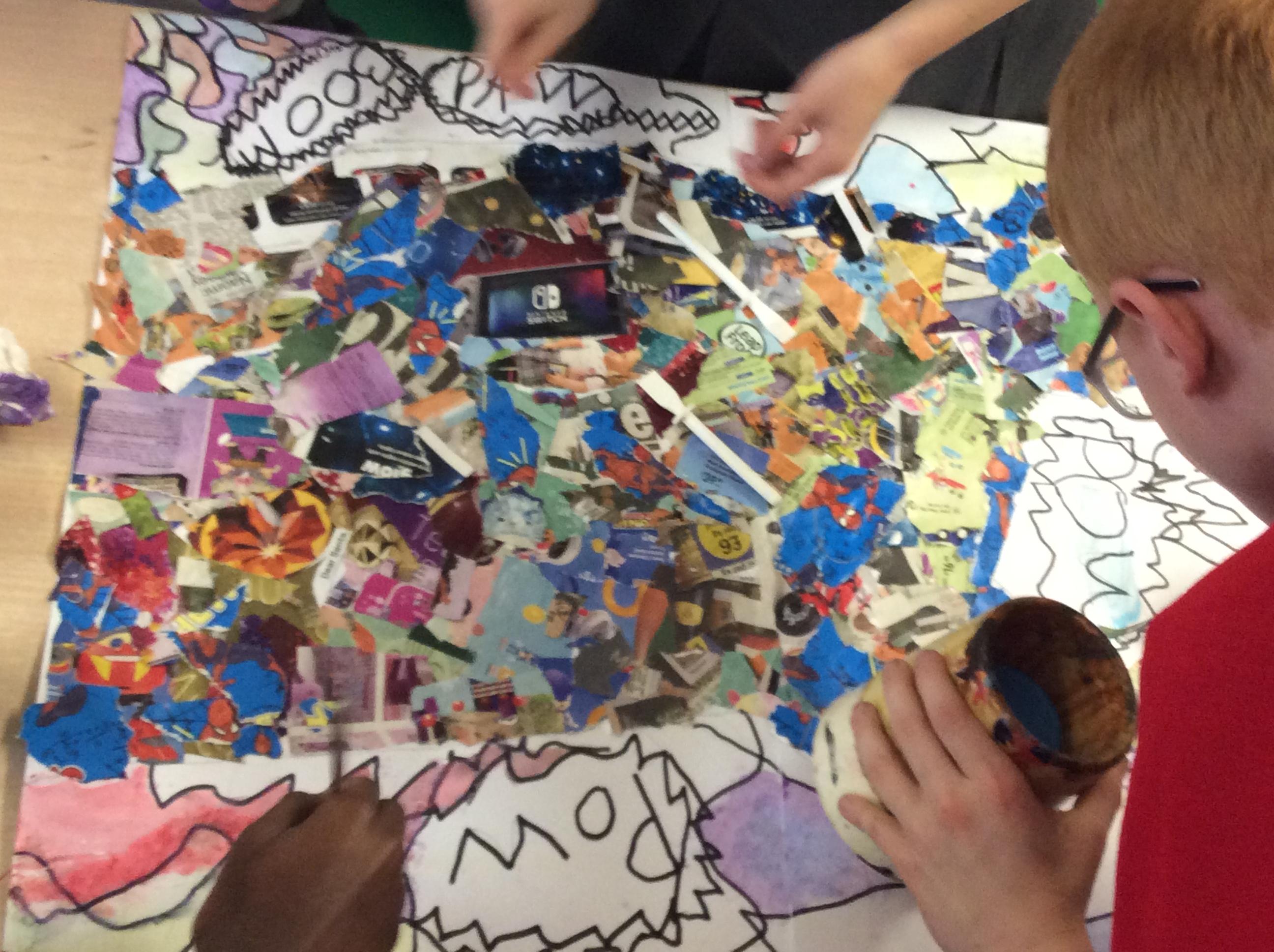 This week in Art, we continued to work on our collaborative Pop Art pieces. We used collage to complete our superhero outlines, we then went over the background with a wash before completing the pieces using a pointillism technique.